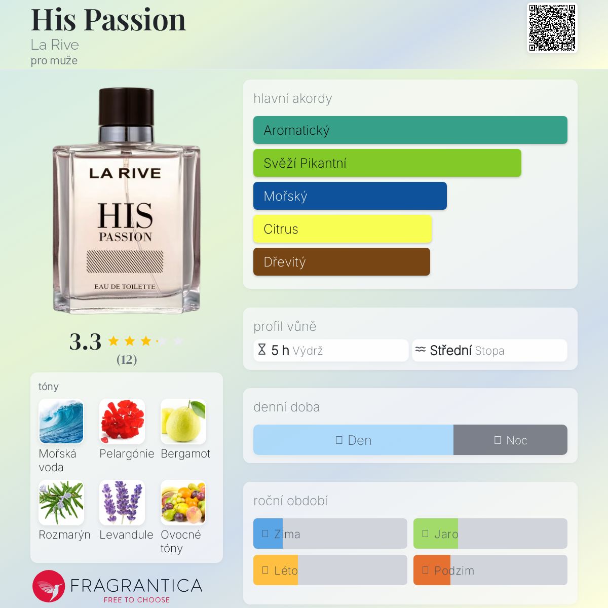 His Passion podle La Rive je Aromatic Aquatic vůně pro muže. His Passion byl/a uveden/a v roce 2021. Vrchní tóny jsou Mořské tóny, Bergamot a Ovoce; střední tóny jsouPelargónie, Rozmarýn a Levandule ; základní tóny jsou Pačuli, Vetiver a Fazole tonka.