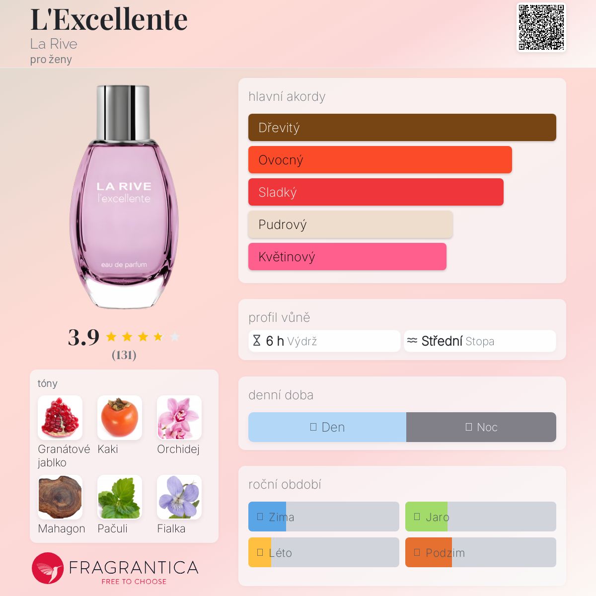 L'Excellente podle La Rive je Floral Fruity vůně pro ženy. L'Excellente byl/a uveden/a v roce 2000. Vrchní tóny jsou Granátové jablko, Kaki, Mučenka, Maliny, Broskev a Zelené tóny; střední tóny jsouOrchidej, Lotus a Magnólie ; základní tóny jsou Mahagon, Pačuli, Fialka, Jantar (ambra), Vanilka a Pižmo.