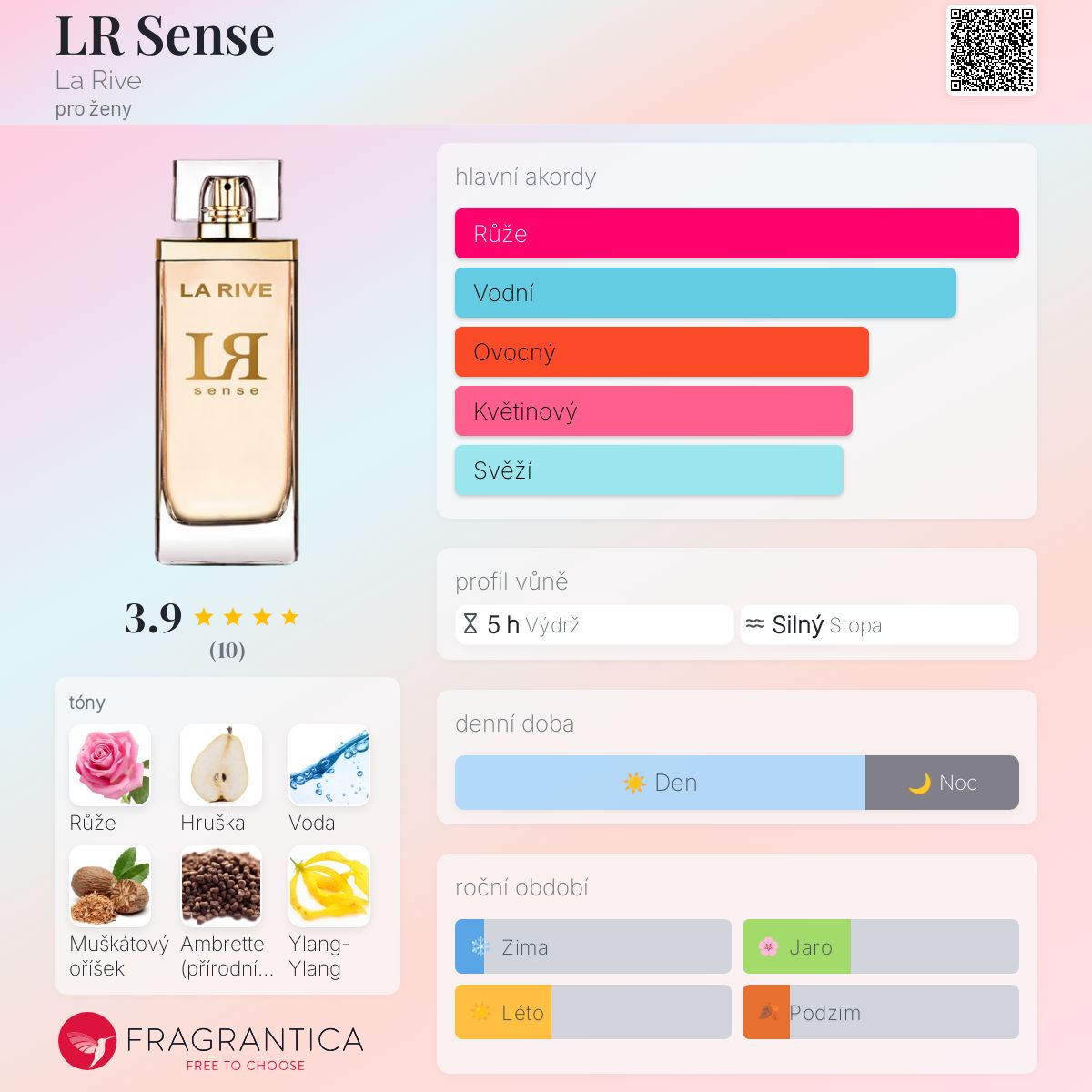 LR Sense podle La Rive je Floral Fruity vůně pro ženy. Vrchní tóny jsou Hruška a Ambrette (přírodní pižmo); střední tóny jsouRůže, Vodní tóny a Ylang-Ylang ; základní tón je Muškátový oříšek.