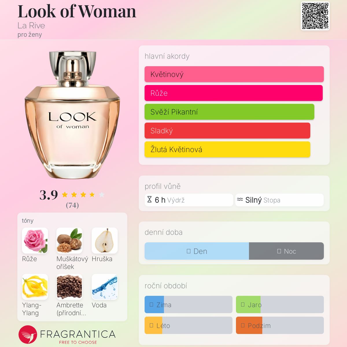Look of Woman podle La Rive je Floral Fruity vůně pro ženy. Vrchní tóny jsou Hruška a Ambrette (přírodní pižmo); střední tóny jsouRůže, Ylang-Ylang a Vodní tóny ; základní tón je Muškátový oříšek.
