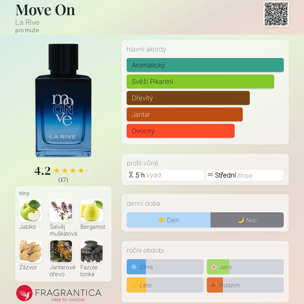 Move On podle La Rive je Aromatic Fougere vůně pro muže. Toto je nová vůně. Move On byl/a uveden/a v roce 2024. Vrchní tóny jsou Jablko, Bergamot a Zázvor; střední tóny jsouŠalvěj muškátová, Jalovcové bobulky a Pelargónie ; základní tóny jsou Jantarové dřevo, Fazole tonka, Cedr, Olibanum a Vetiver.