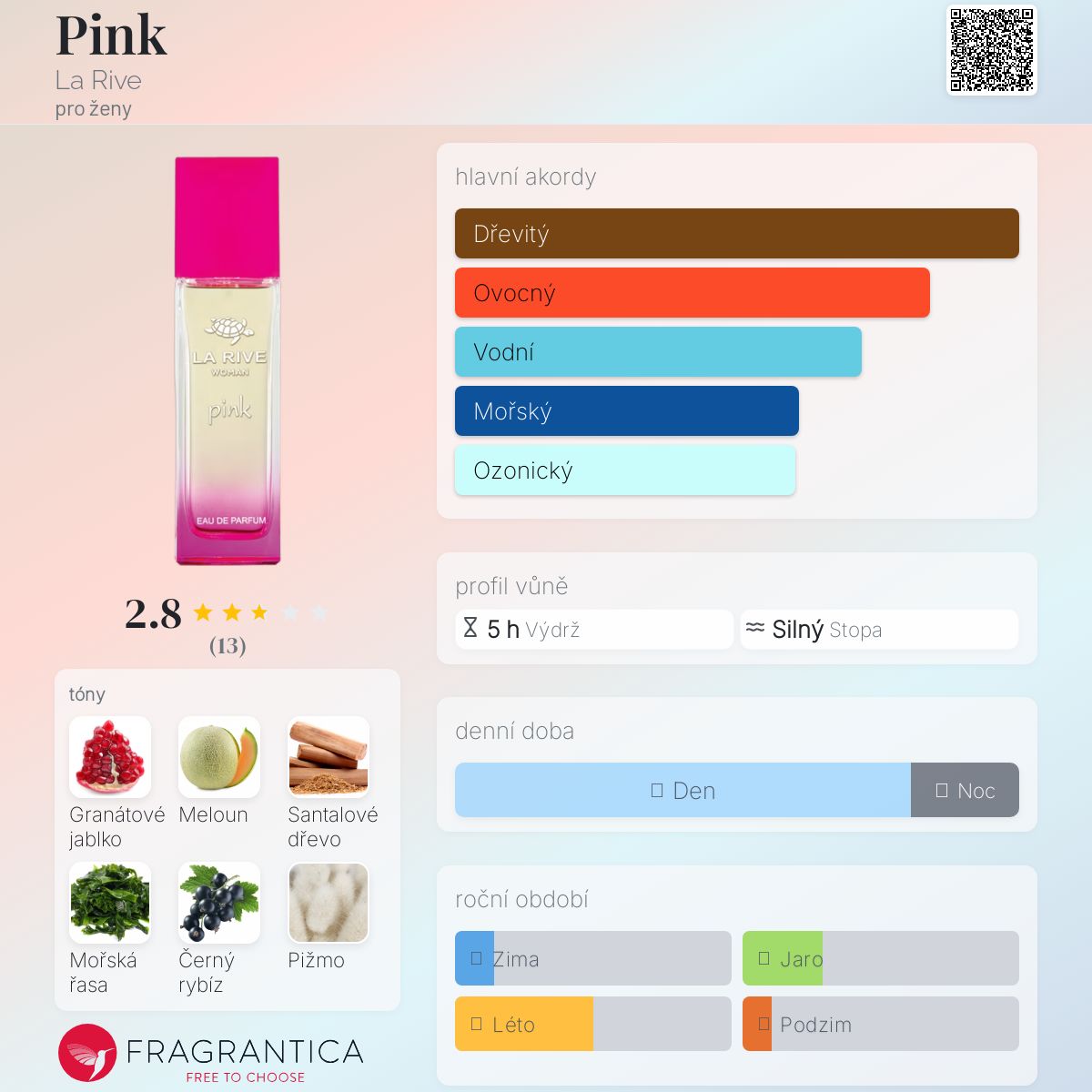 Pink podle La Rive je Citrus Aromatic vůně pro ženy. Vrchní tóny jsou Granátové jablko, Meloun a Mořská řasa; střední tón jeČerný rybíz ; základní tóny jsou Santalové dřevo a Pižmo.