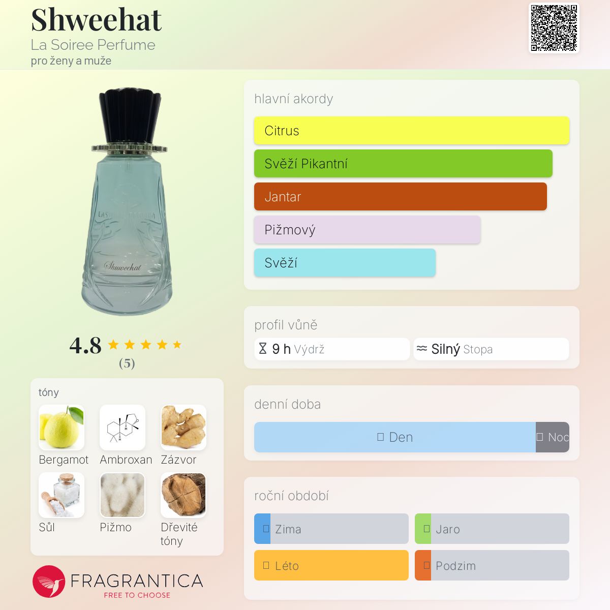 Shweehat podle La Soiree Perfume je Aromatic Aquatic vůně pro ženy a muže. Shweehat byl/a uveden/a v roce 2023. Vrchní tóny jsou Bergamot a Mořská sůl; střední tóny jsouZázvor a Pižmo ; základní tóny jsou Ambroxan a Dřevité tóny.