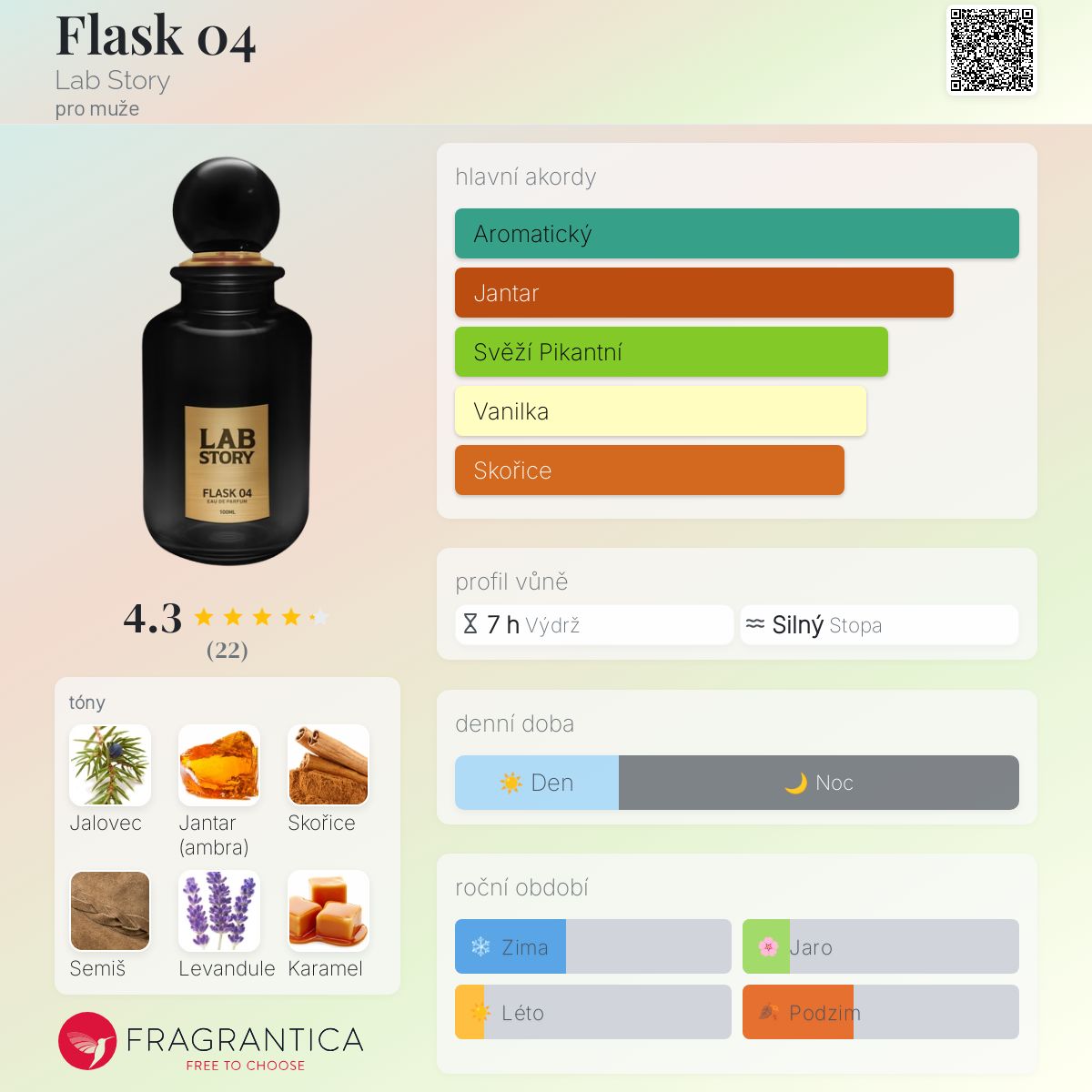Flask 04 podle Lab Story je vůně pro muže. Flask 04 byl/a uveden/a v roce 2023. Vrchní tóny jsou Jalovec, Růžový pepř a Kosatec; střední tóny jsouSkořice, Levandule, Karamel a Šalvěj ; základní tóny jsou Jantar (ambra), Semiš, Vanilka a Fazole tonka.