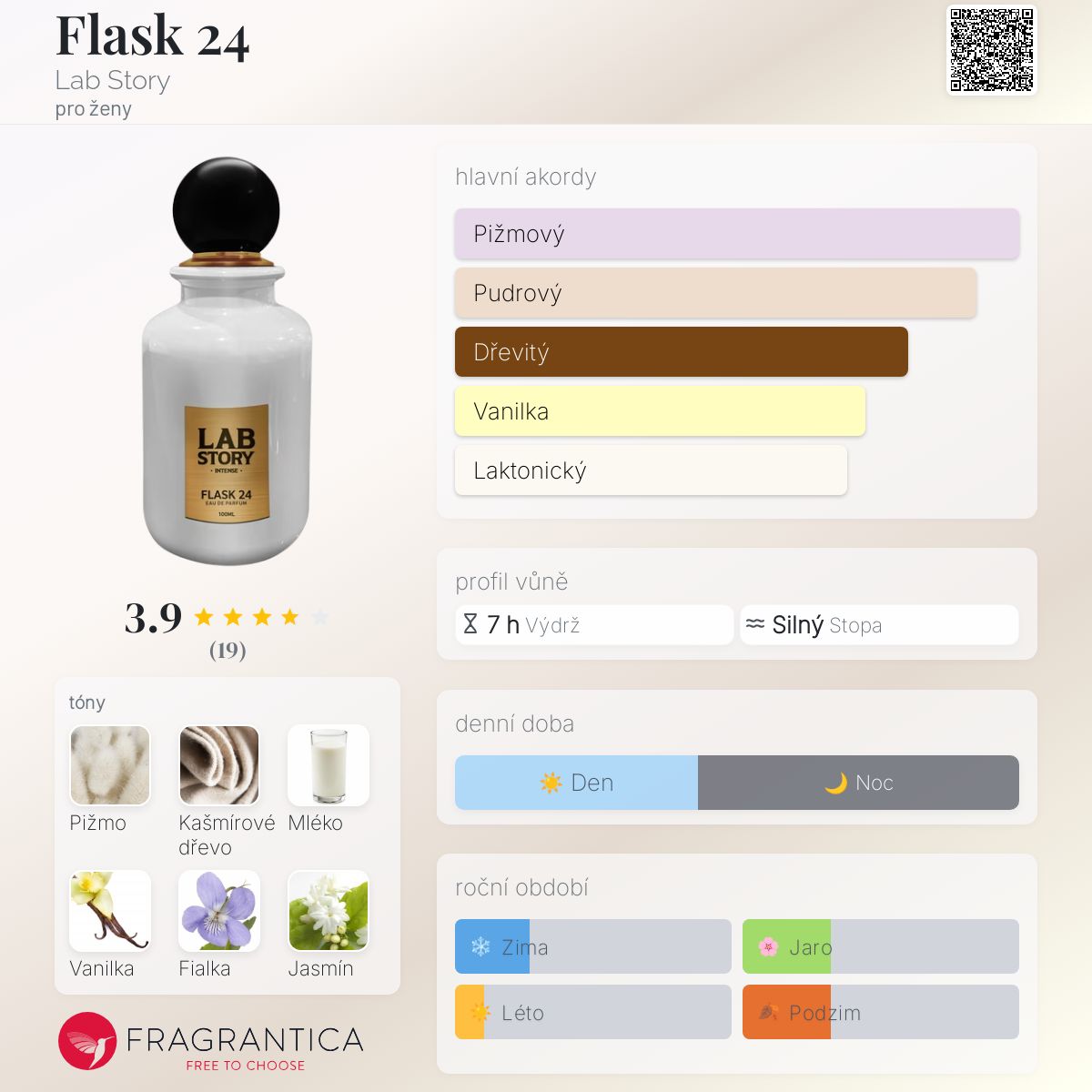 Flask 24 podle Lab Story je vůně pro ženy. Toto je nová vůně. Flask 24 byl/a uveden/a v roce 2023. Vrchní tóny jsou Fialka a Jasmín; střední tóny jsouKašmírové dřevo, Mléko a Santalové dřevo ; základní tóny jsou Pižmo a Vanilka.