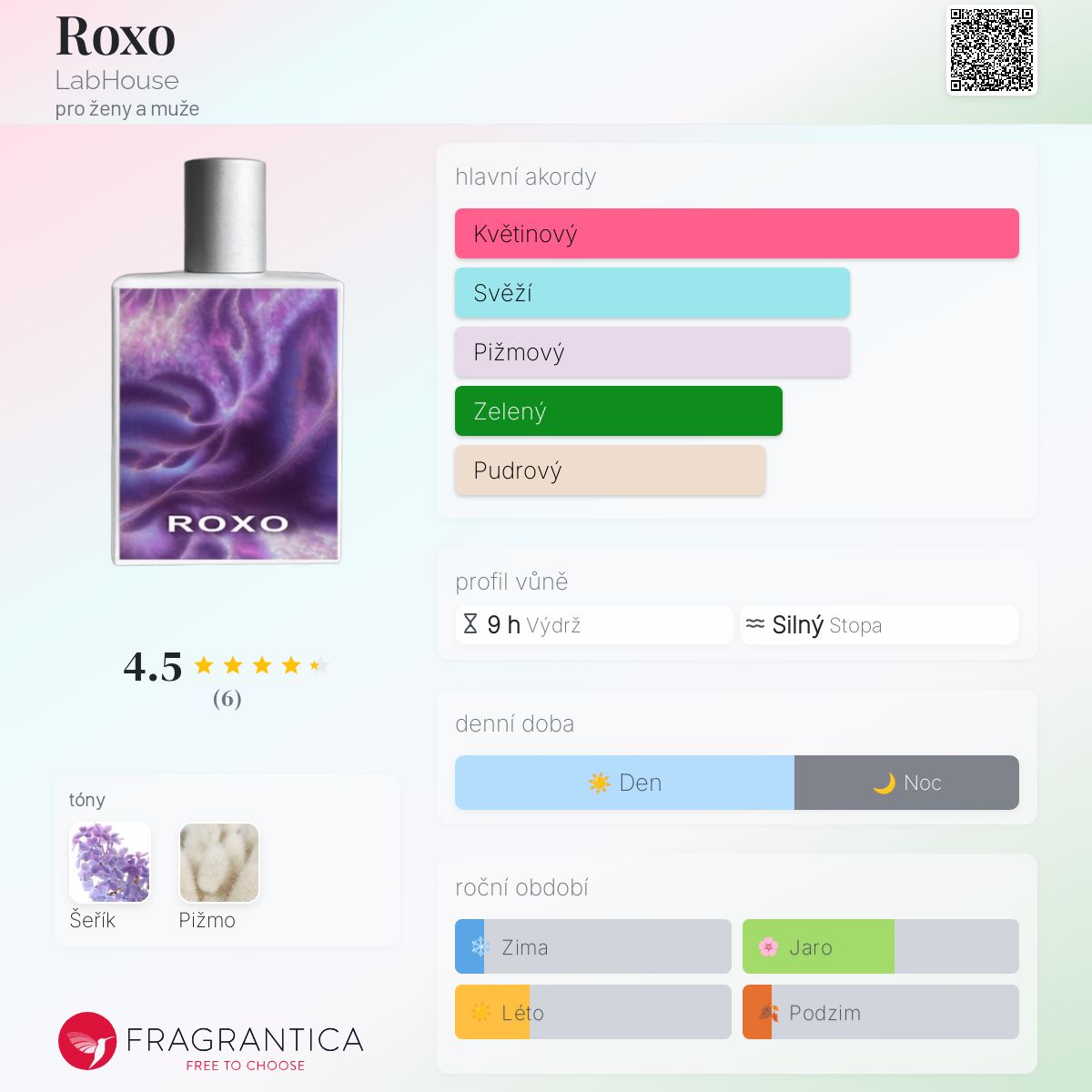 Roxo podle LabHouse je vůně pro ženy a muže. Vrchní tón je Šeřík ; střední tón jeŠeřík ; základní tóny jsou Šeřík a Pižmo.