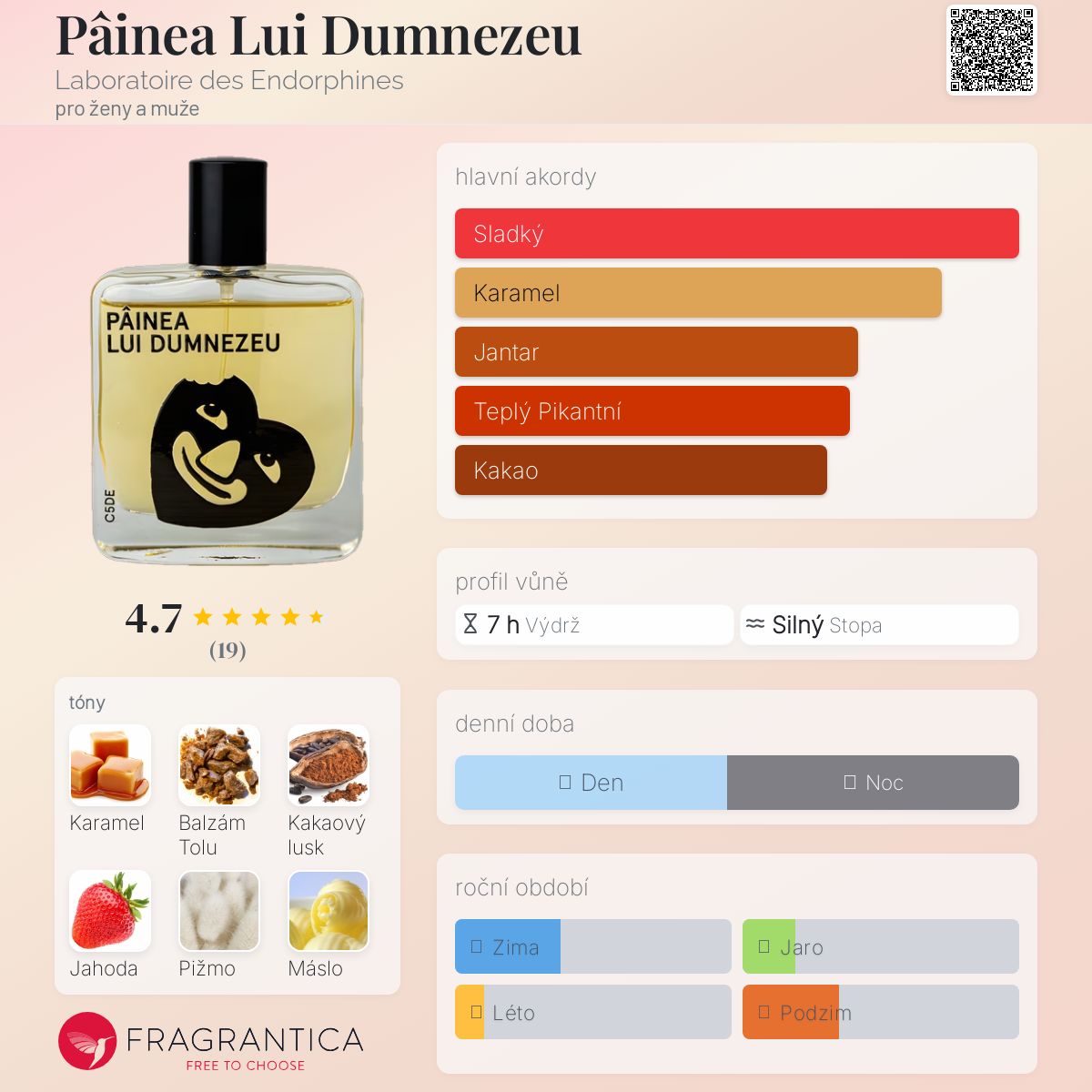 Pâinea Lui Dumnezeu podle Laboratoire des Endorphines je Orientální Vanilla vůně pro ženy a muže. Pâinea Lui Dumnezeu byl/a uveden/a v roce 2023. "Nosem" za touto vůní je Arturetto Landi. Vrchní tóny jsou Jahoda, Máslo, Lískový oříšek, Kokos a Černý rybíz; střední tóny jsouChléb, Šušenka, Pralinka a Okvětní lístky růží ; základní tóny jsou Karamel, Balzám Tolu, Kakao, Bílé pižmo, Peruánský balzám, Vanilka, Čokoláda a Benzoin.