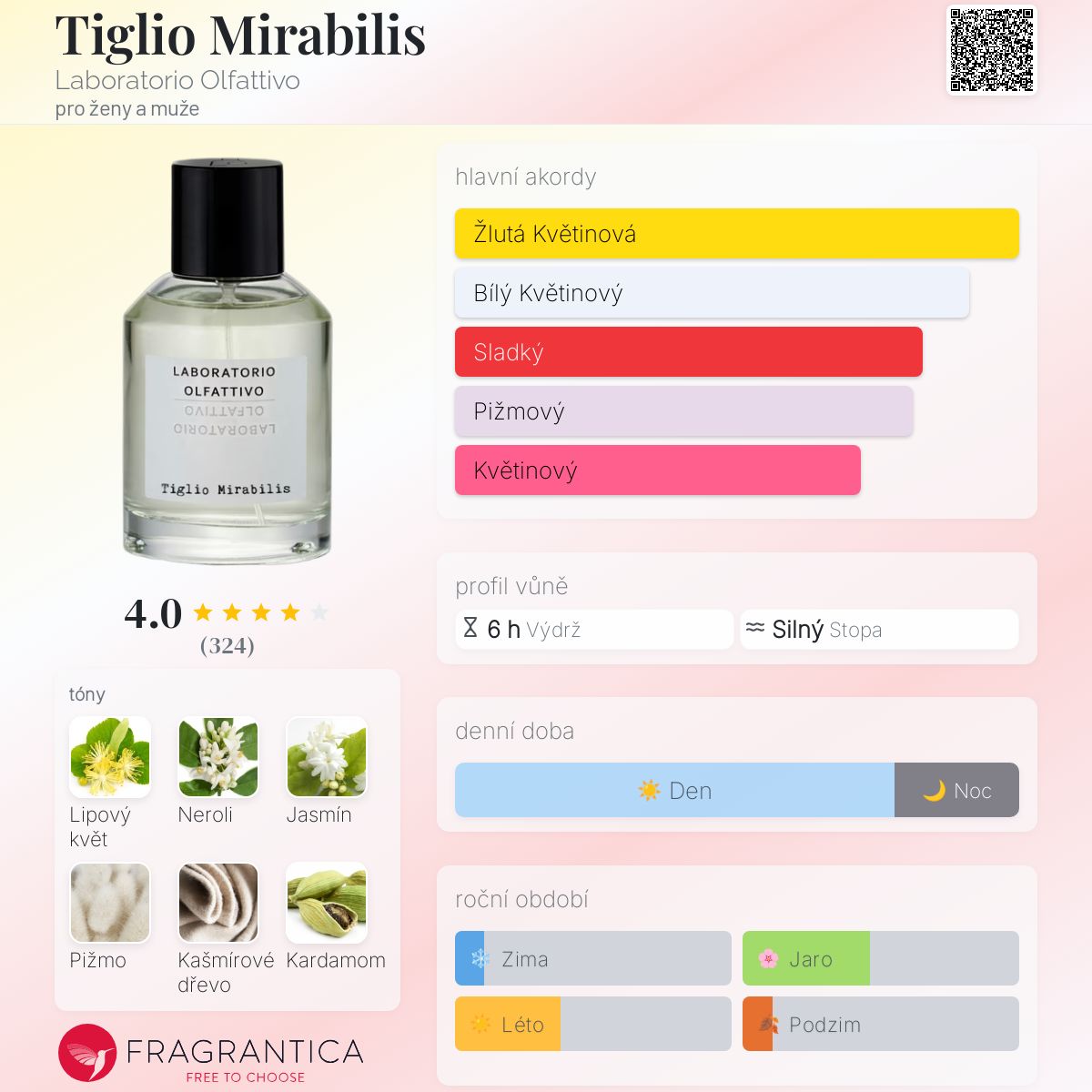 Tiglio Mirabilis podle Laboratorio Olfattivo je Floral vůně pro ženy a muže. Toto je nová vůně. Tiglio Mirabilis byl/a uveden/a v roce 2023. "Nosem" za touto vůní je Luca Maffei. Vrchní tóny jsou Neroli, Kardamom a Zázvor; střední tóny jsouLipový květ a Jasmín ; základní tóny jsou Pižmo a Kašmírové dřevo.