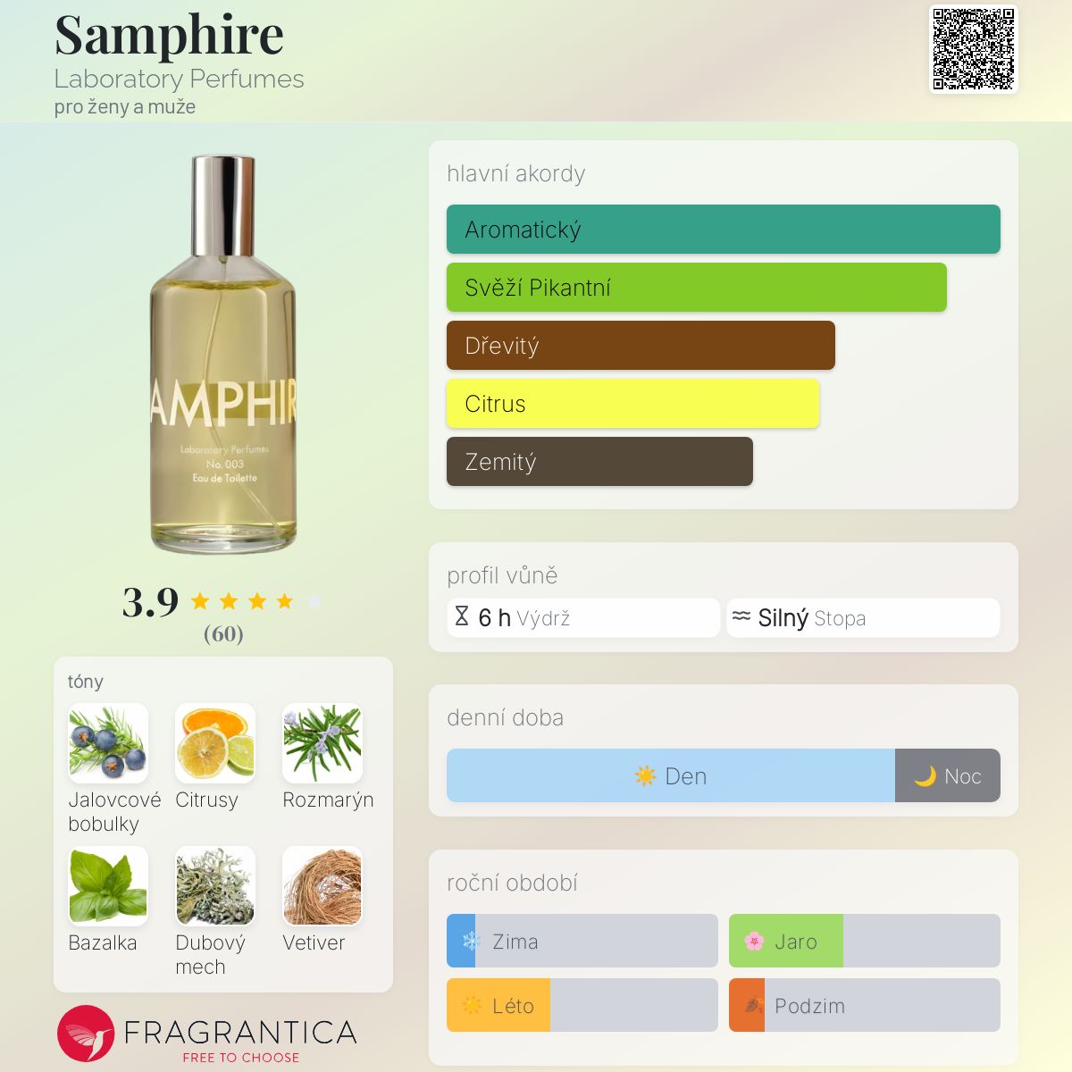 Samphire podle Laboratory Perfumes je Aromatic vůně pro ženy a muže. Samphire byl/a uveden/a v roce 2013. Vrchní tóny jsou Jalovcové bobulky, Černý pepř, Limetka, Bergamot a Citrón a Citrón; střední tóny jsouRozmarýn, Bazalka, Levandule, Citronová tráva, Grapefruit, Mandarinka a Zázvor ; základní tóny jsou Dubový mech, Bílý jantar (ambra), Fazole tonka, Jasmín, Labdanum a Kosatec.