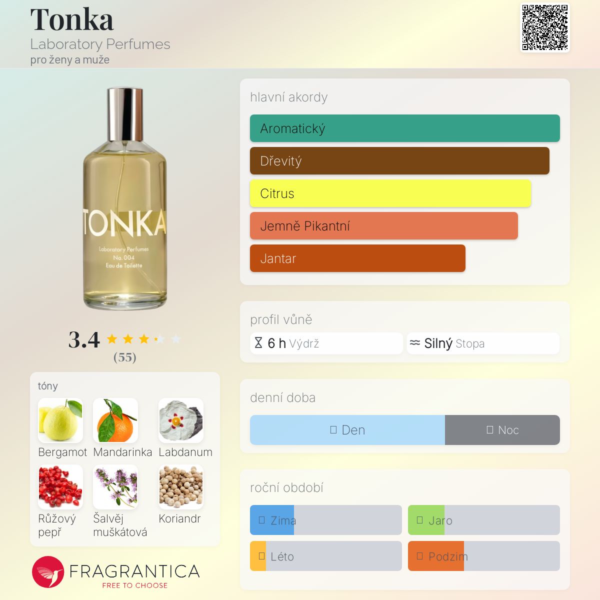 Tonka podle Laboratory Perfumes je Orientální Woody vůně pro ženy a muže. Tonka byla spuštěna během 2010. Vrchní tóny jsou Bergamot, Mandarinka, Labdanum a Růžový pepř; střední tóny jsouŠalvěj muškátová, Koriandr, Dřevité tóny a Ylang-Ylang ; základní tóny jsou Vetiver, Jantar (ambra), Mech a Fazole tonka.