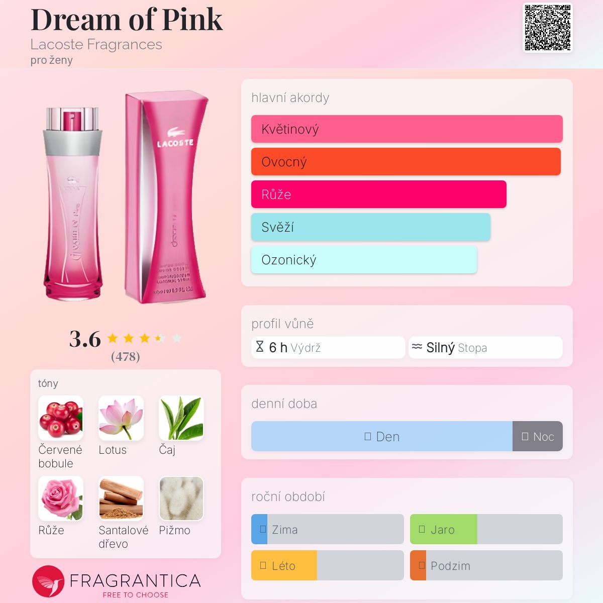 Dream of Pink podle Lacoste Fragrances je Floral Fruity vůně pro ženy. Dream of Pink byl/a uveden/a v roce 2008. Vrchní tóny jsou Červené bobule a Ledový čaj; střední tóny jsouLotus a Růže ; základní tóny jsou Santalové dřevo a Pižmo.