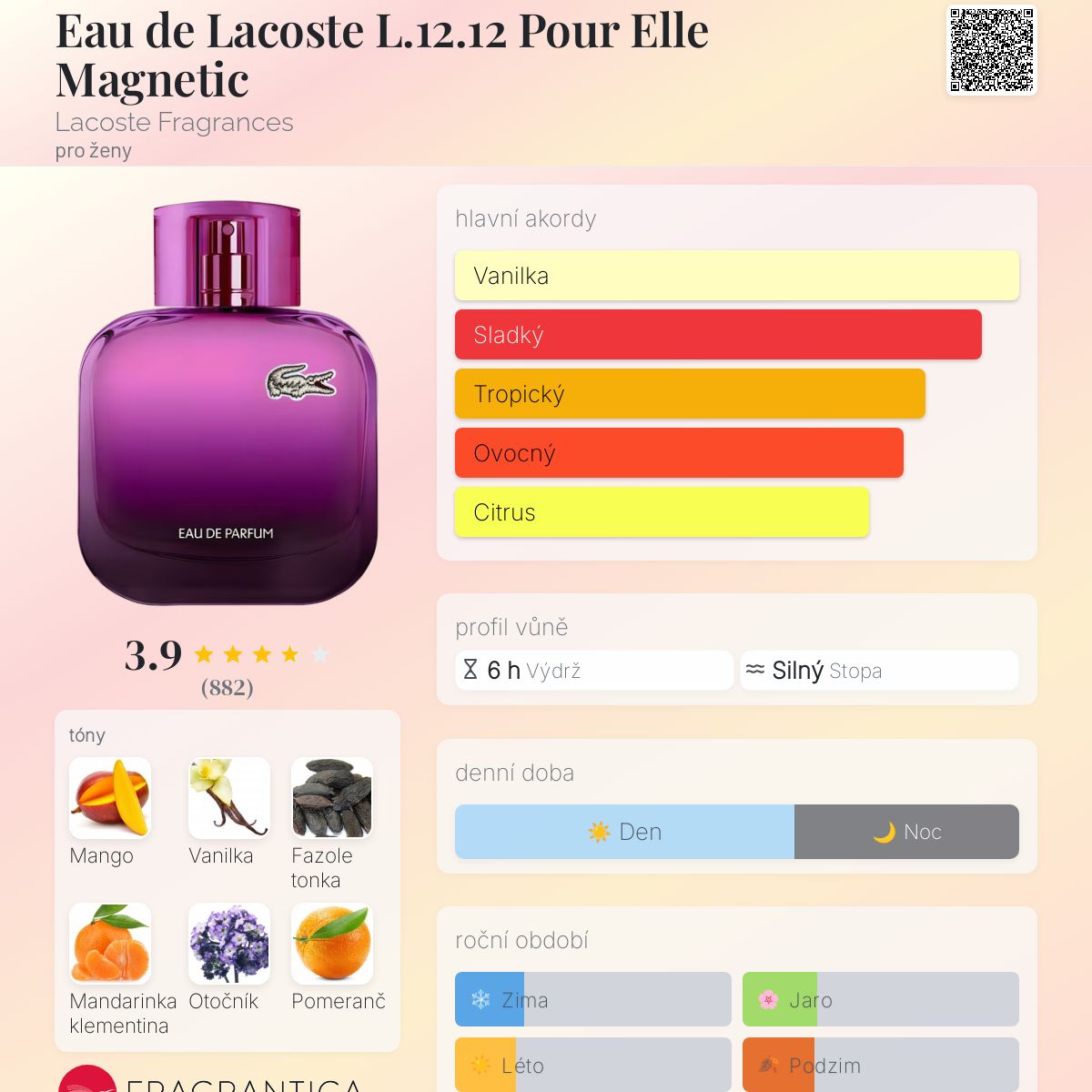 Eau de Lacoste L.12.12 Pour Elle Magnetic podle Lacoste Fragrances je Floral Fruity vůně pro ženy. Eau de Lacoste L.12.12 Pour Elle Magnetic byl/a uveden/a v roce 2016. Vrchní tóny jsou Mango, Mandarinka klementina a Pomeranč; střední tóny jsouOtočník, Fialkový list, Růže a Jasmín ; základní tóny jsou Vanilka, Fazole tonka a Pačuli.