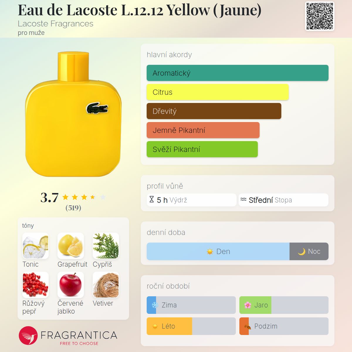 Eau de Lacoste L.12.12 Yellow (Jaune) podle Lacoste Fragrances je Aromatic Fruity vůně pro muže. Eau de Lacoste L.12.12 Yellow (Jaune) byl/a uveden/a v roce 2015. "Nosem" za touto vůní je Sonia Constant. Vrchní tóny jsou Tonic, Grapefruit a Růžový pepř; střední tóny jsouČervené jablko a Koriandr ; základní tóny jsou Cypřiš, Vetiver a Jantar (ambra).