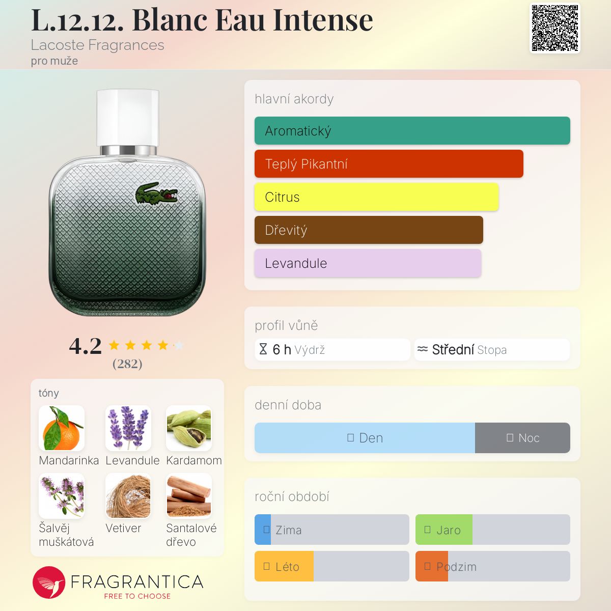 L.12.12. Blanc Eau Intense podle Lacoste Fragrances je Woody Spicy vůně pro muže. Toto je nová vůně. L.12.12. Blanc Eau Intense byl/a uveden/a v roce 2023. L.12.12. Blanc Eau Intense byl/a vytvořen/a Jean-Christophe Hérault a Delphine Lebeau. Vrchní tóny jsou Mandarinka a Kurkuma; střední tóny jsouLevandule, Kardamom a Šalvěj muškátová ; základní tóny jsou Vetiver, Santalové dřevo a Kůže.