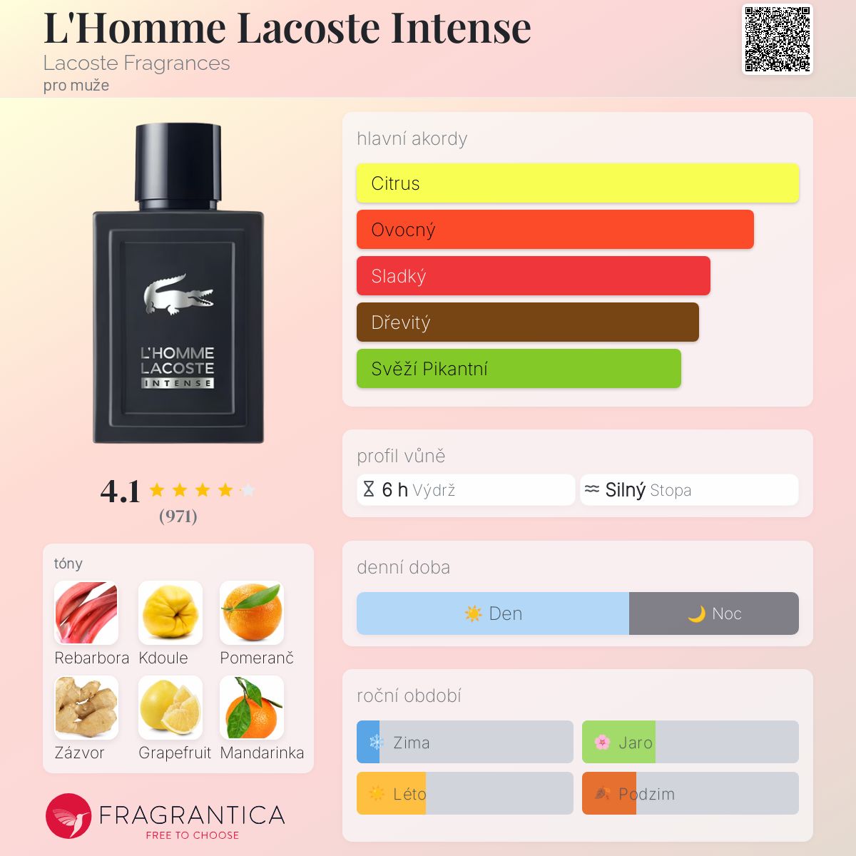 L'Homme Lacoste Intense podle Lacoste Fragrances je Woody Spicy vůně pro muže. L'Homme Lacoste Intense byl/a uveden/a v roce 2018. "Nosem" za touto vůní je Michel Girard. Vrchní tóny jsou Rebarbora, Kdoule, Pomeranč, Grapefruit, Mandarinka a Citrón; střední tóny jsouZázvor, Černý pepř, Ananas, Hedione, Mandle a Jasmín ; základní tóny jsou Vetiver, Vanilka, Jantar (ambra), Cedr, Cypriolový olej, Jantarové dřevo, Dřevo akigala a Pižmo.