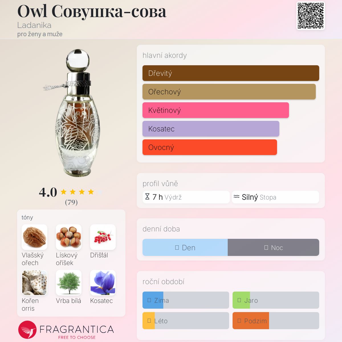 Owl Совушка-сова podle Ladanika je Floral Woody Musk vůně pro ženy a muže. Owl Совушка-сова byl/a uveden/a v roce 2020. "Nosem" za touto vůní je Valeria Karmanova. Vrchní tóny jsou Vlašský ořech, Lískový oříšek, Dřišťál a Maliny; střední tóny jsouKořen orris, Vrba bílá, Rulík a Vřes ; základní tóny jsou Kosatec, Fialka a Brčál.