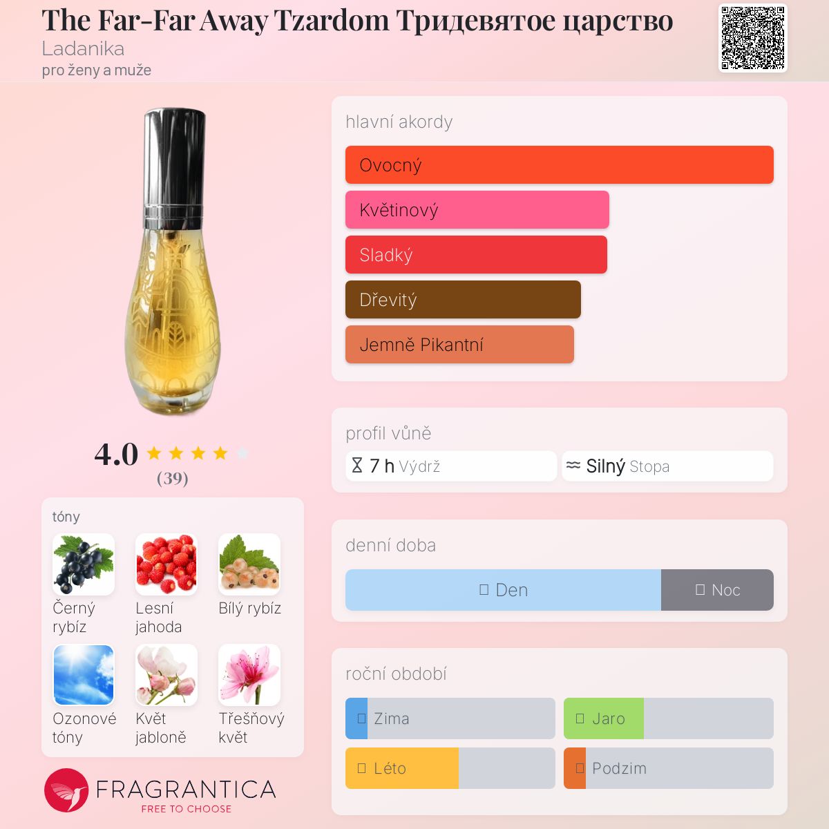 The Far-Far Away Tzardom Тридевятое царство podle Ladanika je Floral Fruity vůně pro ženy a muže. The Far-Far Away Tzardom Тридевятое царство byl/a uveden/a v roce 2020. "Nosem" za touto vůní je Julia Kupriyanova. Vrchní tóny jsou Ozonové tóny a List černého rybízu; střední tóny jsouČerný rybíz, Lesní jahoda, Květ jabloně a Naplavené dříví ; základní tóny jsou Bílý rybíz, Třešňový květ, Vodní tóny a Dubový mech.