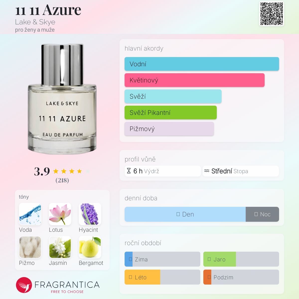 11 11 Azure podle Lake & Skye je Floral Woody Musk vůně pro ženy a muže. Toto je nová vůně. 11 11 Azure byl/a uveden/a v roce 2024. Vrchní tóny jsou Vodní tóny, Hyacint a Bergamot; střední tóny jsouLotus, Jasmín a Kořen orris ; základní tóny jsou Pižmo, Dubový mech a Jantar (ambra).