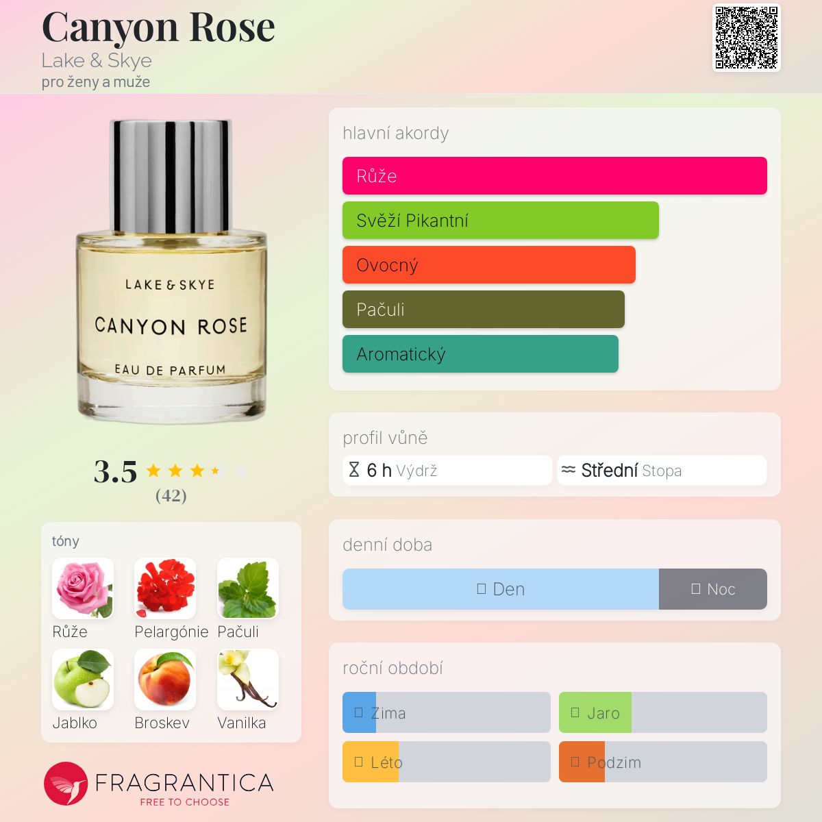 Canyon Rose podle Lake & Skye je Floral vůně pro ženy a muže. Canyon Rose byl/a uveden/a v roce 2020. "Nosem" za touto vůní je Courtney Somer. Vrchní tón je Okvětní lístky růží ; střední tóny jsouPelargónie, Pačuli a Vanilka ; základní tóny jsou Zelené jablko a Broskev.