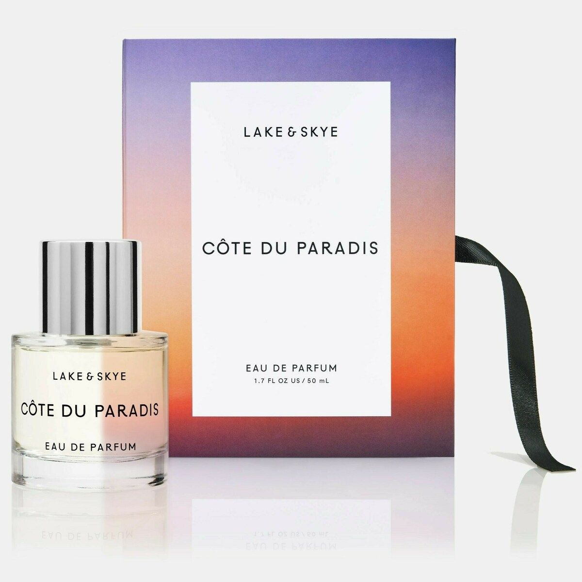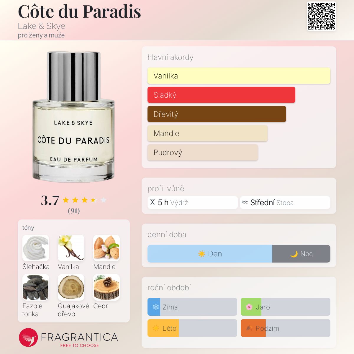 Côte du Paradis podle Lake & Skye je Woody vůně pro ženy a muže. Côte du Paradis byl/a uveden/a v roce 2021. "Nosem" za touto vůní je Courtney Somer. Vrchní tóny jsou Mandle a Otočník; střední tóny jsouŠlehačka, Guajakové dřevo a Santalové dřevo ; základní tóny jsou Vanilka, Fazole tonka a Cedr.