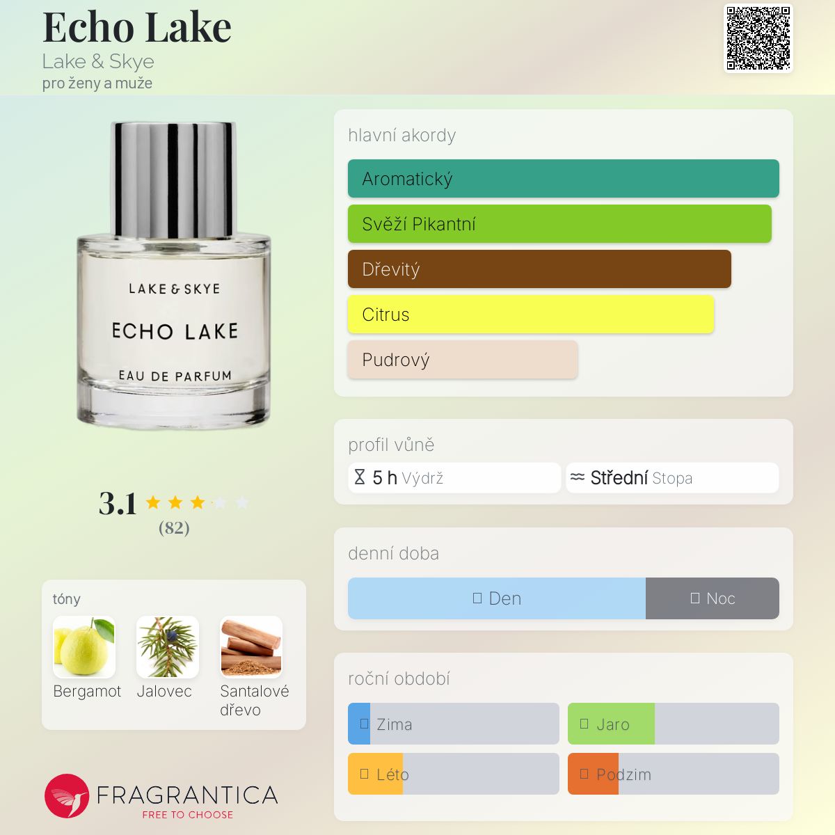 Echo Lake podle Lake & Skye je Woody Floral Musk vůně pro ženy a muže. Echo Lake byl/a uveden/a v roce 2016. "Nosem" za touto vůní je Courtney Somer. Vrchní tón je Bergamot ; střední tón jeJalovec ; základní tón je Santalové dřevo.