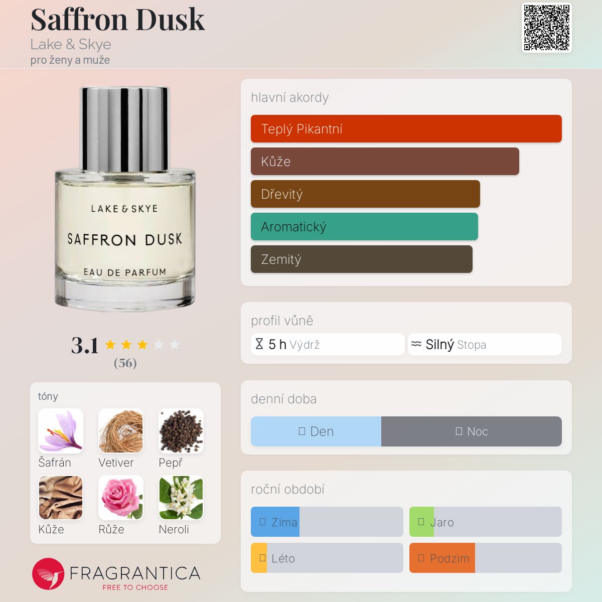 Saffron Dusk podle Lake & Skye je Woody Spicy vůně pro ženy a muže. Saffron Dusk byl/a uveden/a v roce 2022. Vrchní tóny jsou Šafrán a Pepř; střední tóny jsouKůže, Růže a Neroli ; základní tóny jsou Vetiver a Santalové dřevo.