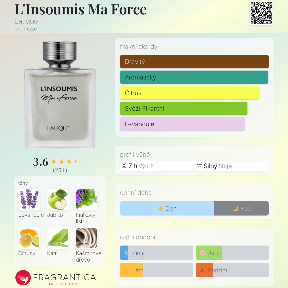 L'Insoumis Ma Force podle Lalique je Woody Aromatic vůně pro muže. L'Insoumis Ma Force byl/a uveden/a v roce 2018. "Nosem" za touto vůní je Fabrice Pellegrin. Vrchní tóny jsou Zelené jablko, Citrusy, Kardamom a Citrón; střední tóny jsouLevandule, Fialkový list, Kafr a Rozmarýn ; základní tóny jsou Kašmírové dřevo, Dřevité tóny a Jantar (ambra).