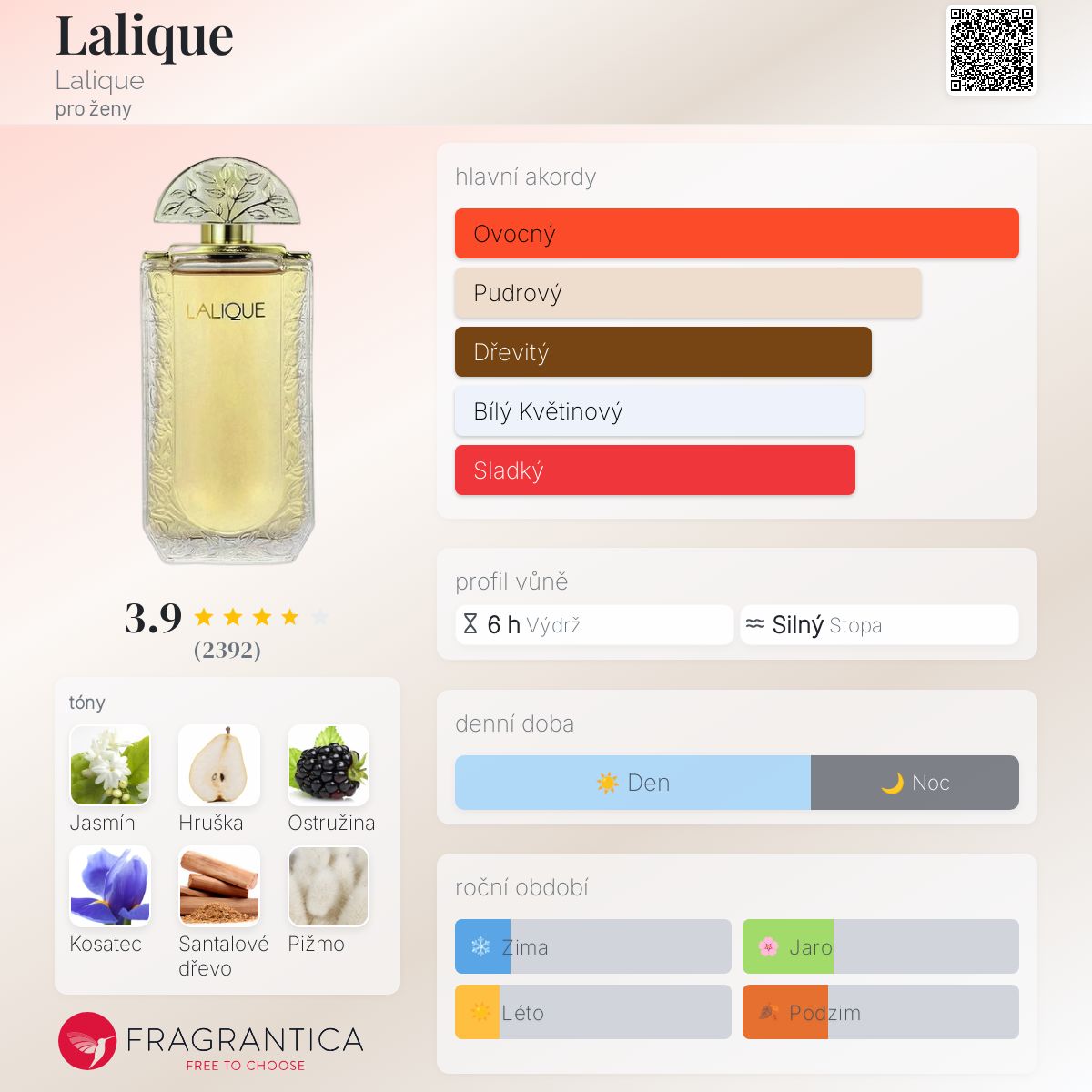 Lalique podle Lalique je Orientální Floral vůně pro ženy. Lalique byl/a uveden/a v roce 1992. "Nosem" za touto vůní je Sophia Grojsman. Vrchní tóny jsou Jasmín, Kosatec, Růže a Hřebíček; střední tóny jsouHruška, Ostružina a Černý rybíz ; základní tóny jsou Santalové dřevo, Bílé pižmo a Vanilka.