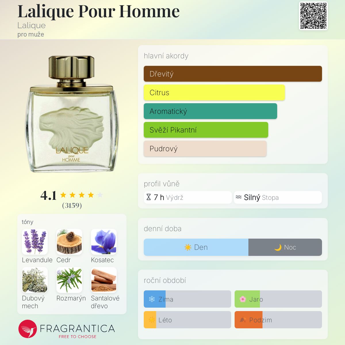 Lalique Pour Homme podle Lalique je Woody Aromatic vůně pro muže. Lalique Pour Homme byl/a uveden/a v roce 1997. "Nosem" za touto vůní je Maurice Roucel. Vrchní tóny jsou Levandule, Rozmarýn, Bergamot, Grapefruit, Pomelo a Mandarinka a Mandarinka; střední tóny jsouCedr, Kosatec, Konvalinka a Jasmín ; základní tóny jsou Dubový mech, Santalové dřevo, Vanilka, Pačuli a Jantar (ambra).