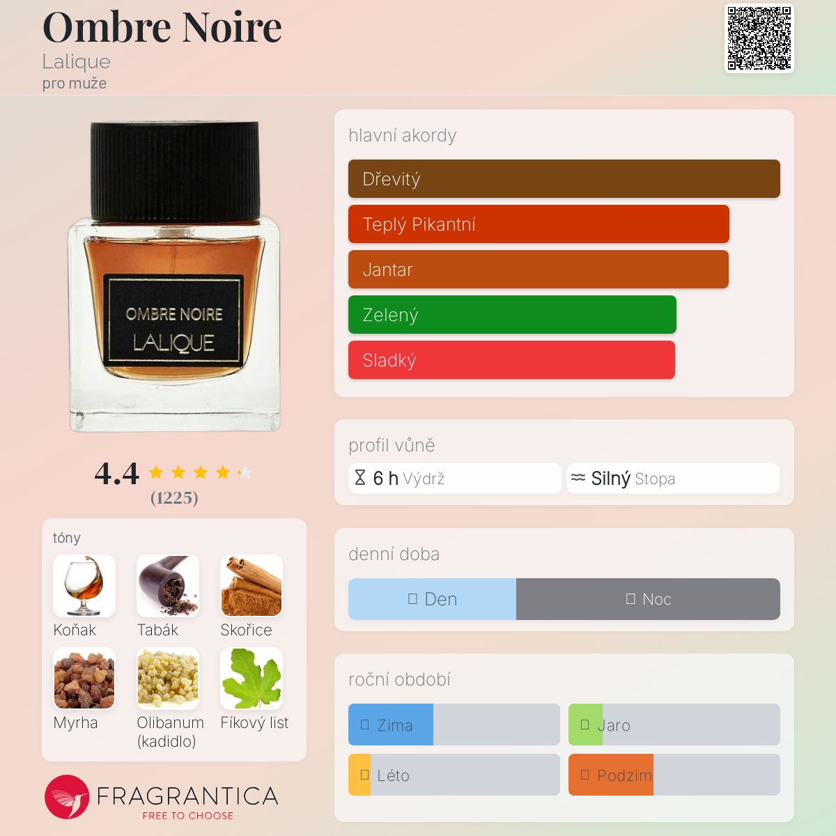 Ombre Noire podle Lalique je Orientální Spicy vůně pro muže. Ombre Noire byl/a uveden/a v roce 2017. "Nosem" za touto vůní je Karine Dubreuil-Sereni. Vrchní tóny jsou Fíkový list, Máta a Bergamot; střední tóny jsouTabákový list, Skořice a Papyrus ; základní tóny jsou Koňak, Myrha, Olibanum, Cedr a Fazole tonka.