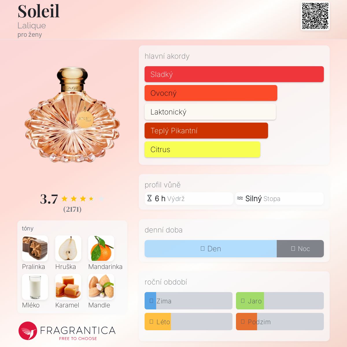Soleil de Lalique má rozporuplné názory, zejména na fragrantice v angličtině. Nejzajímavější je, že se rozcházejí i čichové vjemy... Protože se od sebe hodně liší. Proto chci vyzdvihnout dva body, pokud vás tento parfém zaujal.