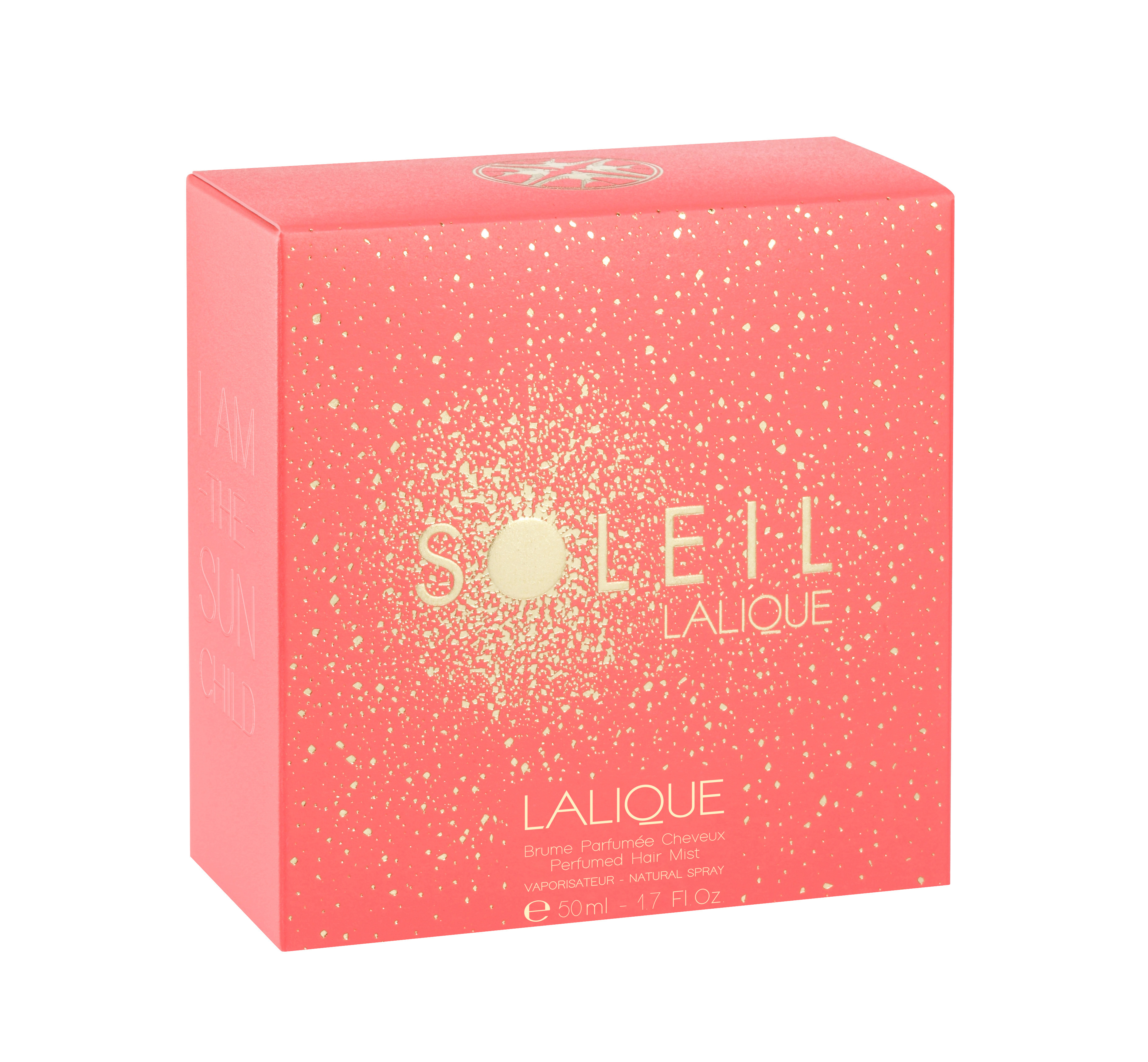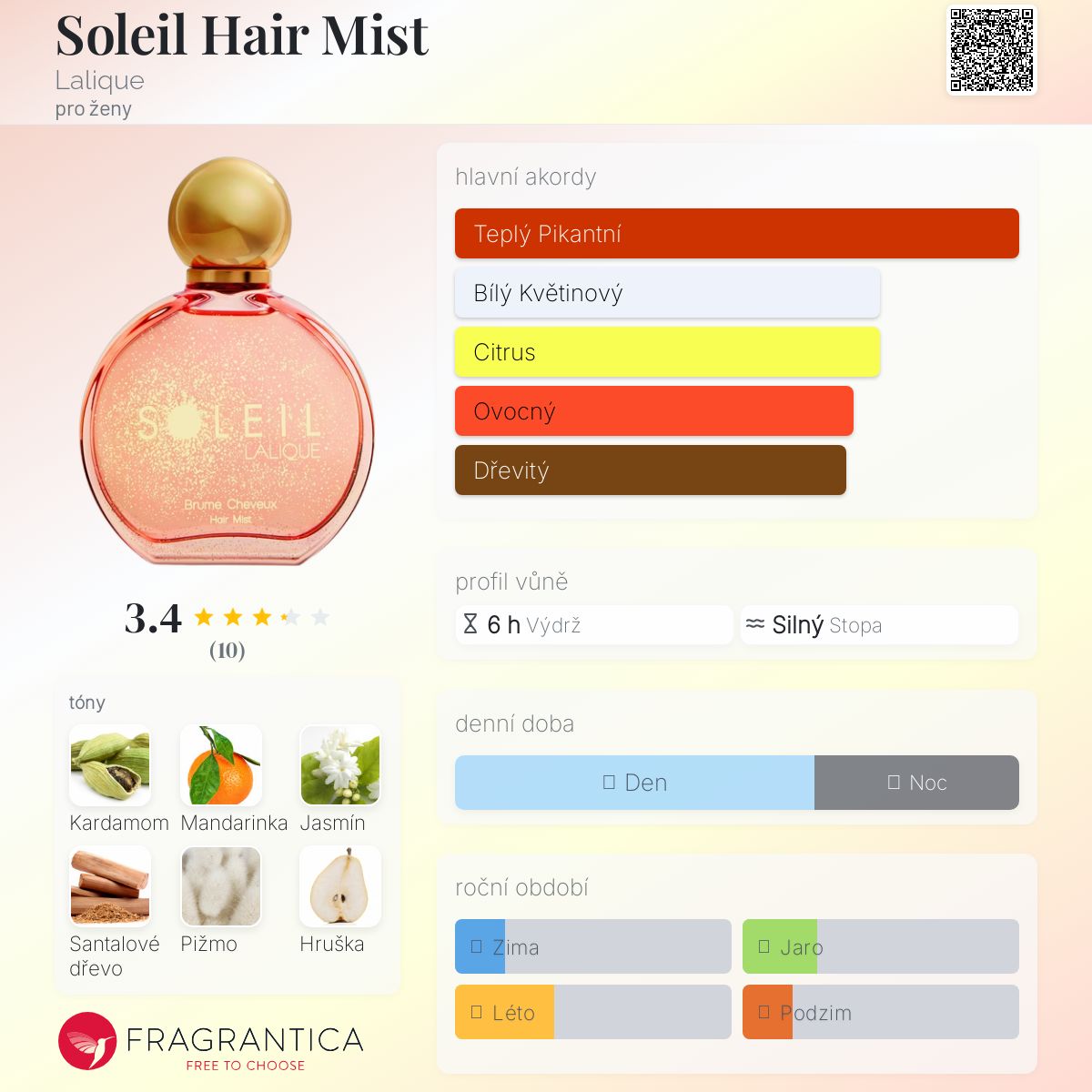 Soleil Hair Mist podle Lalique je Floral Fruity Gourmand vůně pro ženy. Soleil Hair Mist byl/a uveden/a v roce 2020. Soleil Hair Mist byl/a vytvořen/a Barbara Zoebelein, Alexandra Monet a Benoist Lapouza. Vrchní tóny jsou Kardamom, Mandarinka a Hořká mandle; střední tóny jsouJasmín, Hruška a Káva ; základní tóny jsou Santalové dřevo, Pižmo a Kandované mandle.