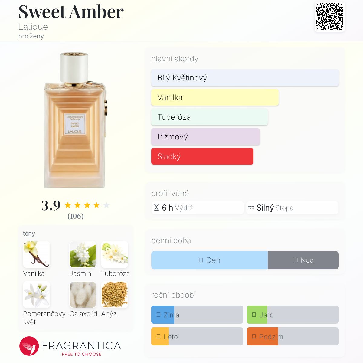Sweet Amber podle Lalique je Orientální Floral vůně pro ženy. Sweet Amber byl/a uveden/a v roce 2018. "Nosem" za touto vůní je Philippe Romano.