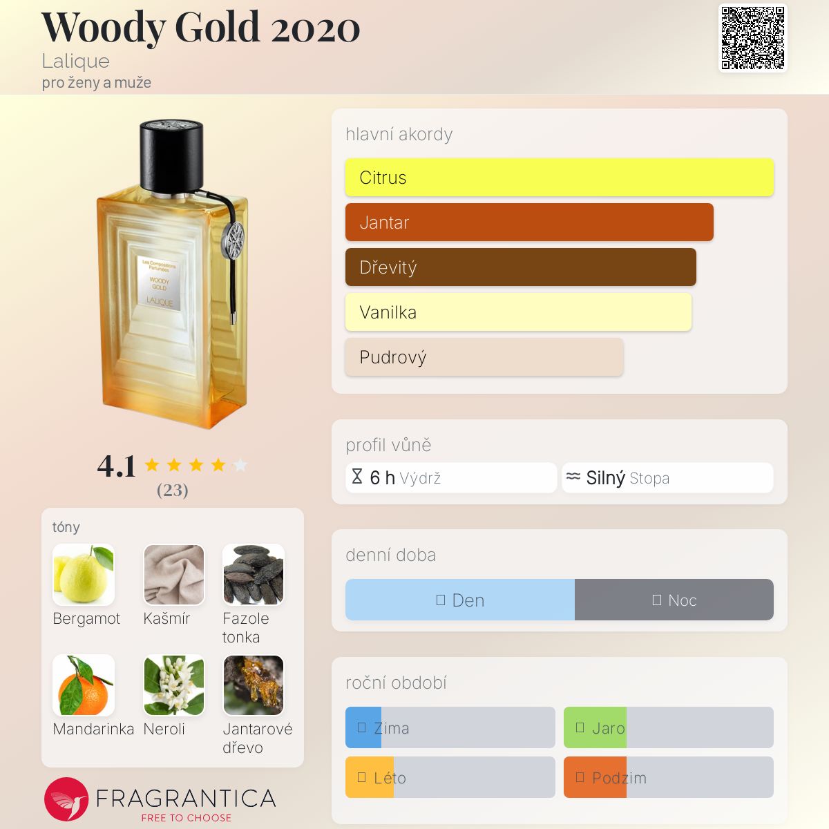 Woody Gold 2020 podle Lalique je Orientální Woody vůně pro ženy a muže. Woody Gold 2020 byl/a uveden/a v roce 2020. "Nosem" za touto vůní je Mathilde Bijaoui. Vrchní tóny jsou Bergamot a Mandarinka; střední tón jeNeroli ; základní tóny jsou Kašmír, Fazole tonka, Jantarové dřevo a Vanilka.