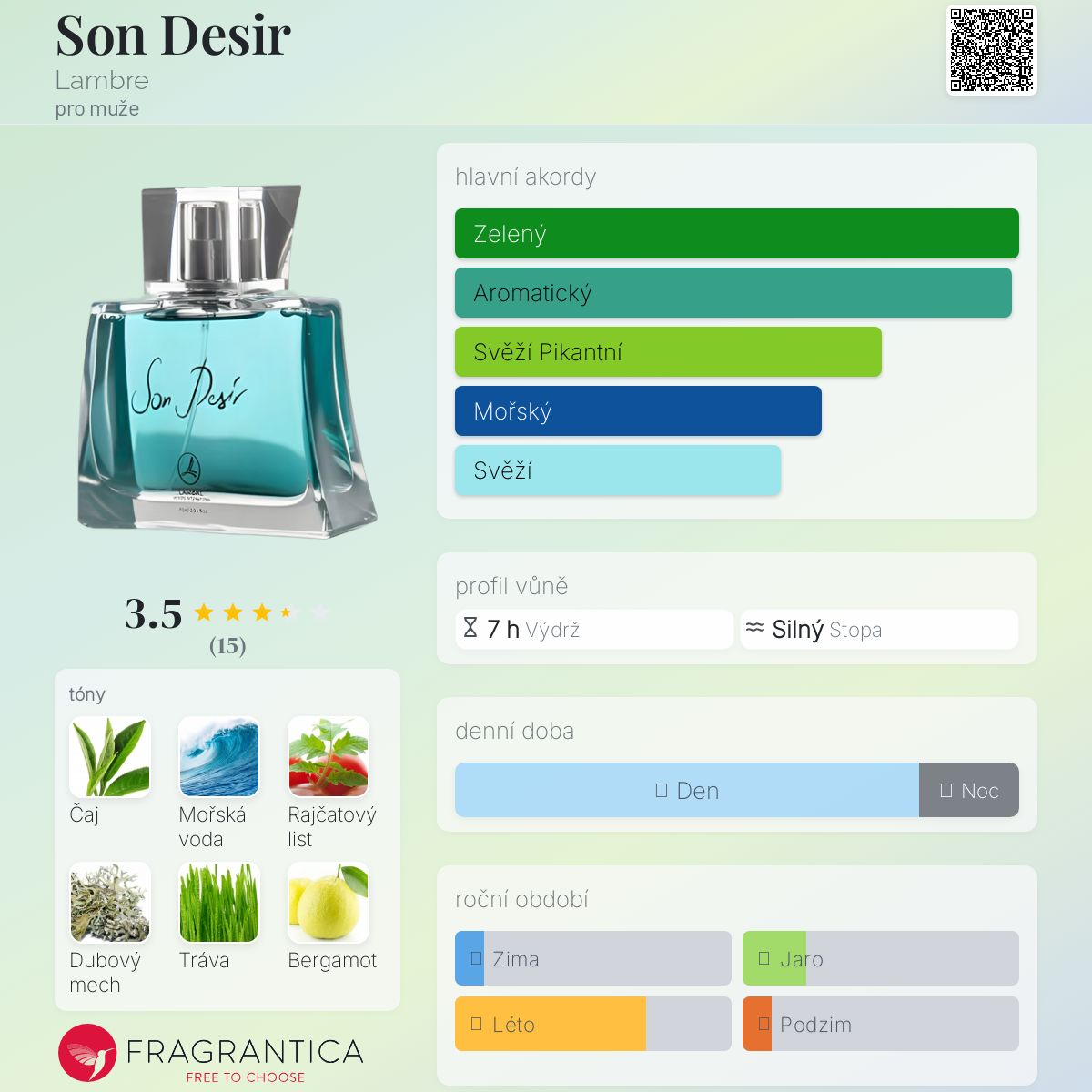 Son Desir podle Lambre je Aromatic Green vůně pro muže. Son Desir byl/a uveden/a v roce 2012. "Nosem" za touto vůní je Bertrand Duchaufour. Vrchní tóny jsou Rajčatový list, Bergamot, Rozmarýn, Máta a Galbanum; střední tóny jsouČaj, Mořská voda a Tráva ; základní tóny jsou Dubový mech, Pačuli, Jantar (ambra) a Pižmo.