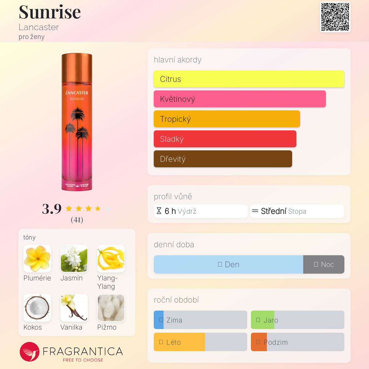 Sunrise podle Lancaster je Floral Fruity vůně pro ženy. Sunrise byl/a uveden/a v roce 2018. "Nosem" za touto vůní je Marie Salamagne. Vrchní tóny jsou Mandarinka, Černý rybíz, Pomeranč, Bergamot a Růžový grapefruit; střední tóny jsouPlumérie, Jasmín Sambac, Ylang-Ylang, Kokos a Broskev ; základní tóny jsou Vanilka, Pižmo, Ambroxan, Cedr a Kašmírové dřevo.