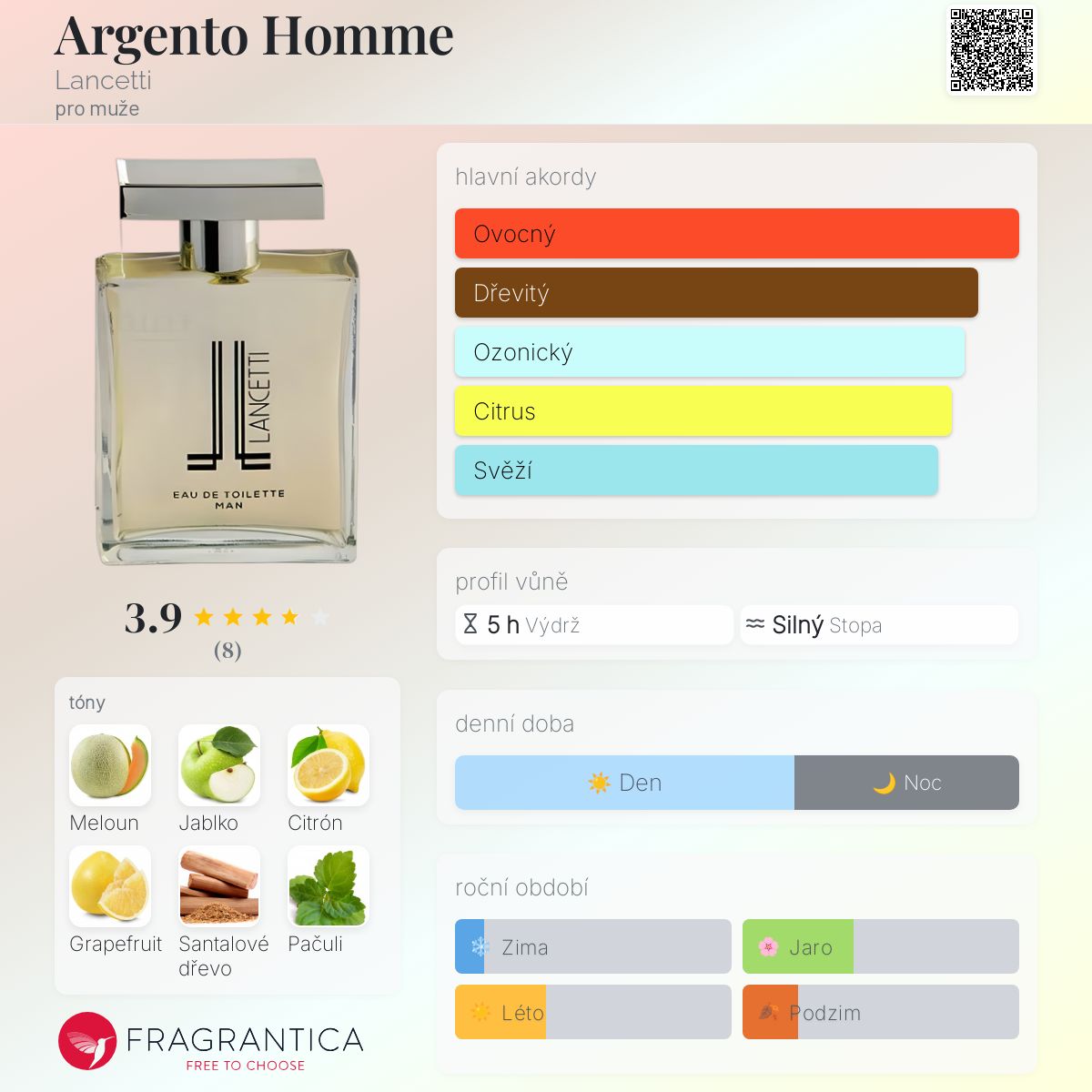 Argento Homme podle Lancetti je Woody Aquatic vůně pro muže. Argento Homme byl/a uveden/a v roce 2017. "Nosem" za touto vůní je Paolo Cerizza. Vrchní tóny jsou Meloun, Zelené jablko, Citrón, Grapefruit a Vodnaté tóny; střední tóny jsouSantalové dřevo, Pačuli, Guajakové dřevo a Vetiver ; základní tóny jsou Bílé pižmo, Dubový mech a Ambra.