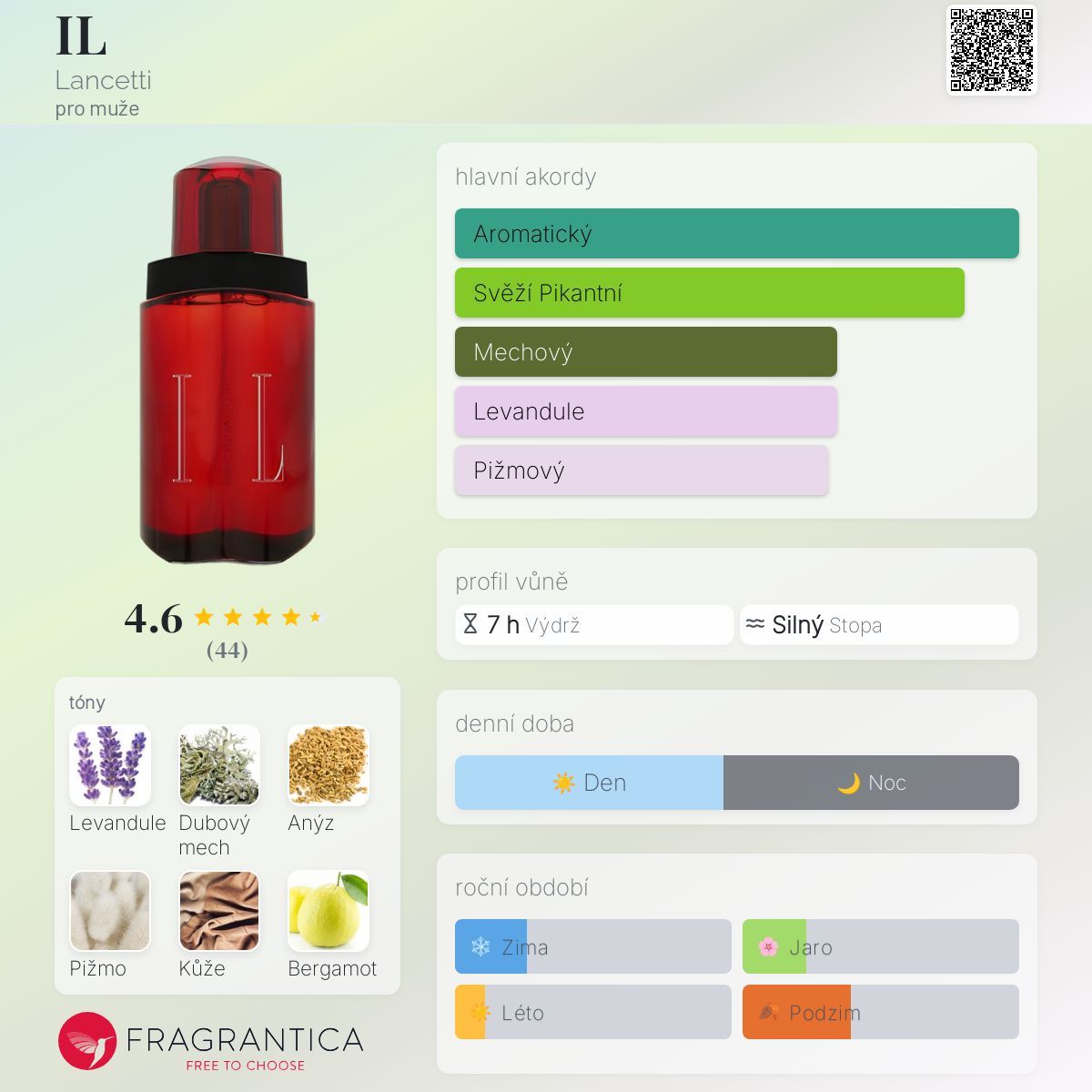IL podle Lancetti je Orientální Fougere vůně pro muže. IL byl/a uveden/a v roce 1990. Vrchní tóny jsou Levandule, Anýz, Bergamot, Neroli, Pelyněk a Bazalka; střední tóny jsouKarafiát, Pelargónie, Aldehydy, Koriandr, Muškátový oříšek a Kapradina ; základní tóny jsou Mech, Pižmo, Kůže, Jantar (ambra), Vetiver a Cedr.