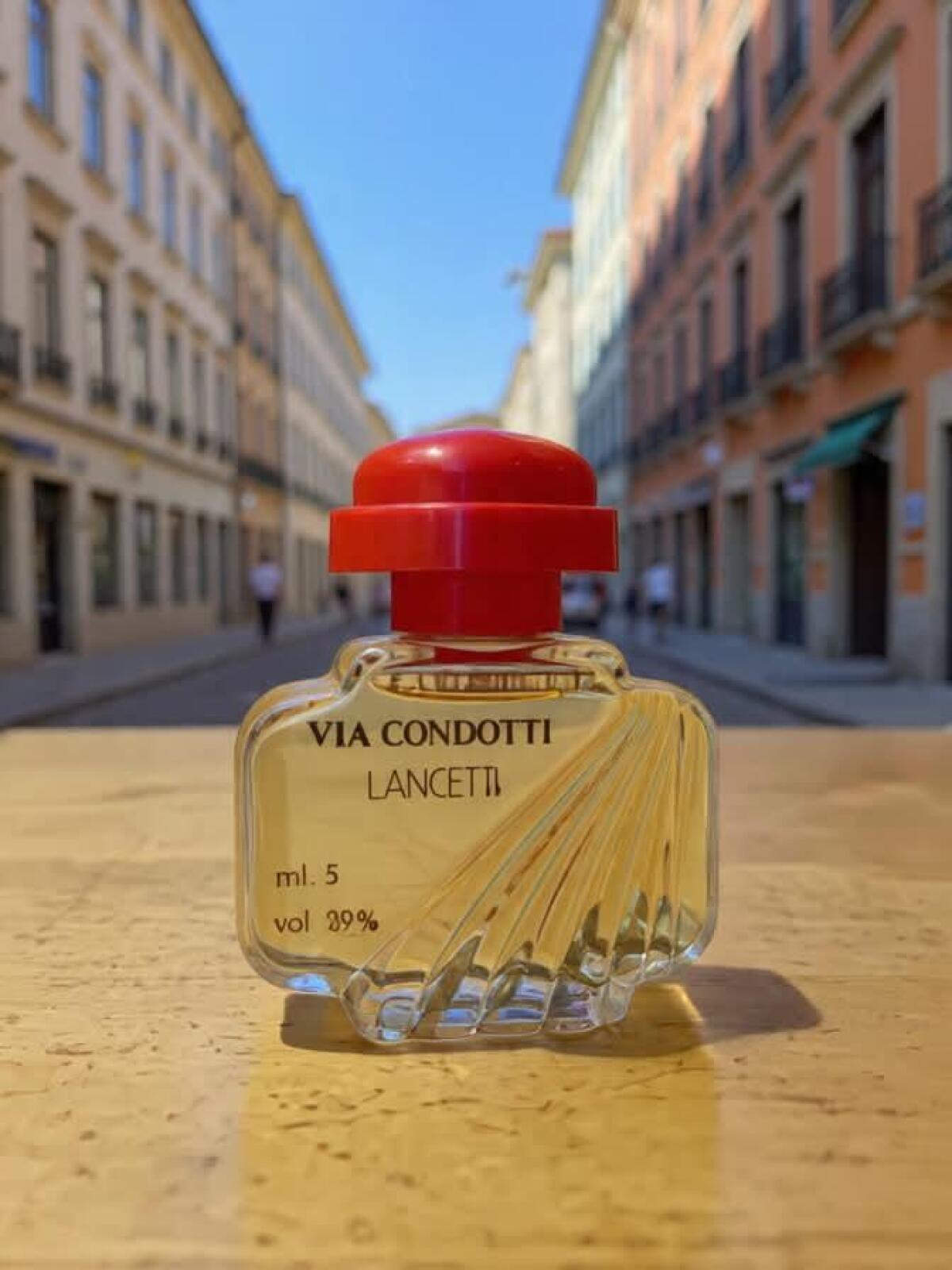 Via Condotti Pour Femme podle Lancetti je Floral Aldehyde vůně pro ženy. Via Condotti Pour Femme byl/a uveden/a v roce 1985. Vrchní tóny jsou Aldehydy, Anýz, Ovocné tóny, Mandarinka a Zelené tóny; střední tóny jsouBrambořík, Jasmín, Otočník, Růže, Konvalinka a Kořen kosatce ; základní tóny jsou Santalové dřevo, Vetiver, Jantar (ambra), Benzoin, Pižmo a Vanilka.