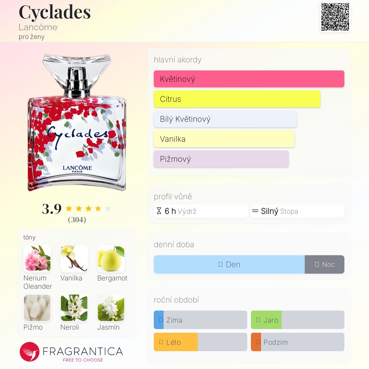 Cyclades podle Lancôme je Floral vůně pro ženy. Cyclades byl/a uveden/a v roce 2008. Vrchní tóny jsou Bergamot a Neroli; střední tóny jsouNerium Oleander a Jasmín ; základní tóny jsou Vanilka a Bílé pižmo.