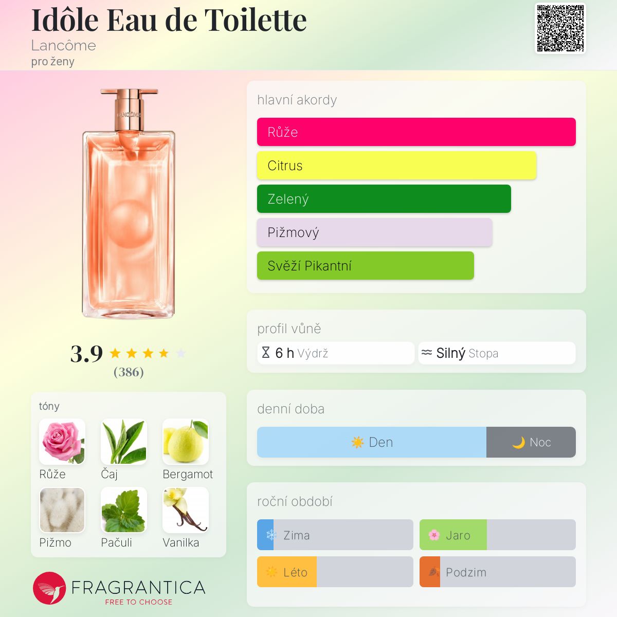 EDIT: Tento parfém vydrží déle, než jsem si myslela: Vůně se projevuje 3-4 hodiny, pak ještě 4-6 hodin intimního schnutí. Budete muset stříkat víc. Je uklidňující a spíše lázeňská vůně. Pro mě je hodna plného flakonu. Mám ráda svěží růže. Líbí se mi také Yves Rocher Comme Une Evidence, která je lehká, a edt verze Libre. Obě jsou silnější než edt Idole.