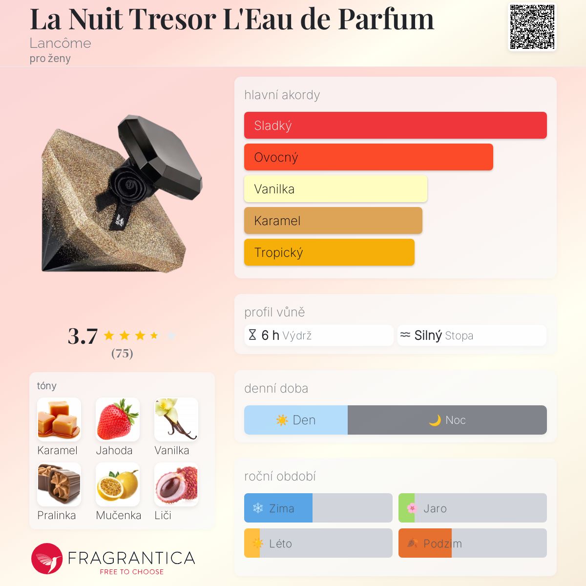 La Nuit Tresor L'Eau de Parfum podle Lancôme je Orientální Vanilla vůně pro ženy. La Nuit Tresor L'Eau de Parfum byl/a uveden/a v roce 2018. La Nuit Tresor L'Eau de Parfum byl/a vytvořen/a Christophe Raynaud a Amandine Clerc-Marie. Vrchní tóny jsou Hruška, Mandarinka a Bergamot; střední tóny jsouJahoda, Mučenka, Vanilková orchidej a Černá růže ; základní tóny jsou Karamel, Vanilka, Pralinka, Liči, Káva, Pačuli, Papyrus, Kadidlo, Lékořice a Fazole tonka.