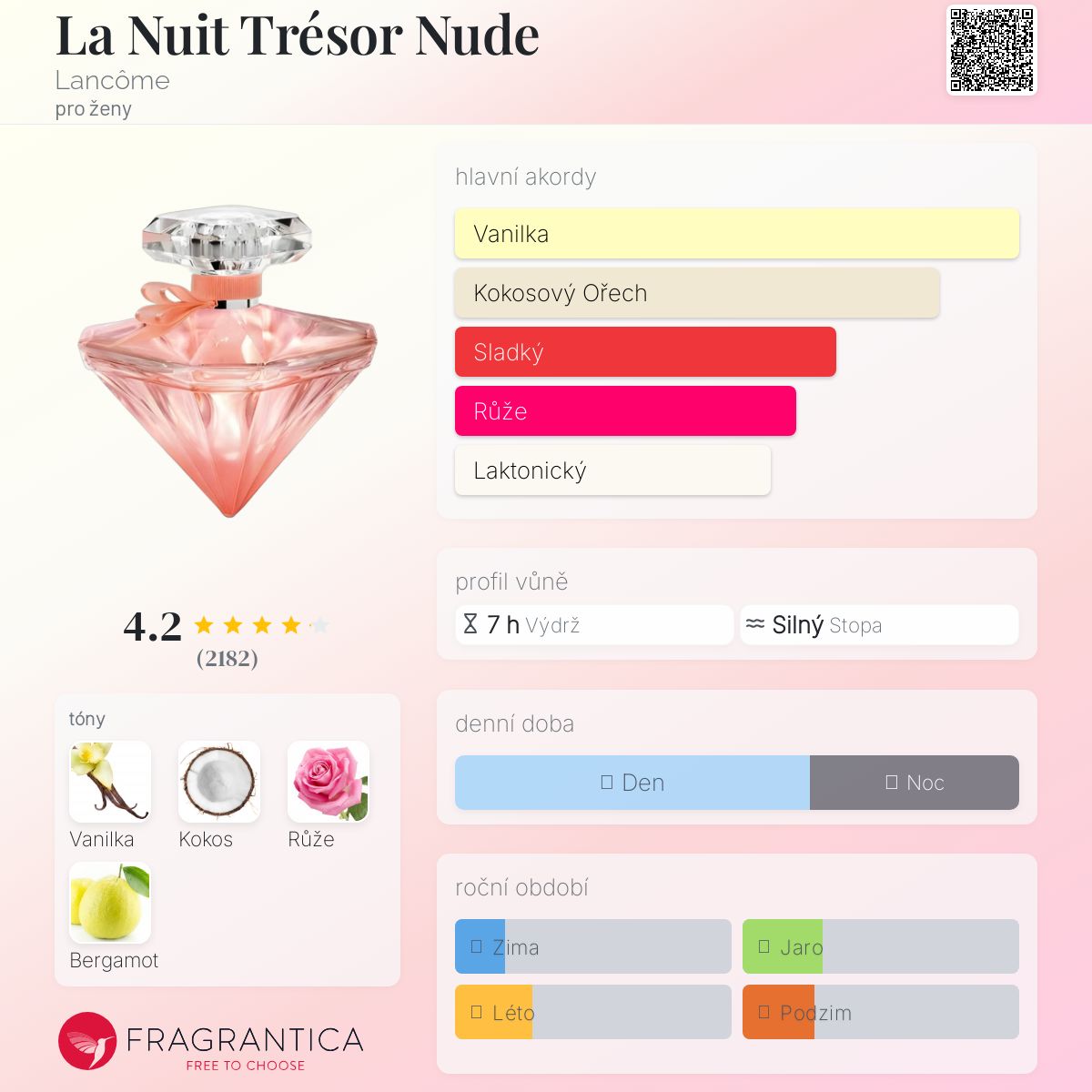 La Nuit Tresor Nude. Velmi příjemný, intimní, nikoliv vtíravý parfém. Ideální pro mírnější dny nebo několik stříknutí v teplejších dnech. Skutečný parfém na druhou kůži. Velmi příjemná. Připomíná kokosový krém na opalování. Pro všechny příležitosti, věkové kategorie a emoce. Romantická. Necítím růži, jen kokosový krém s vanilkou a trochou bergamotu, který rozbíjí sladkost a nedělá ji mazlavou. Velmi lahodná.