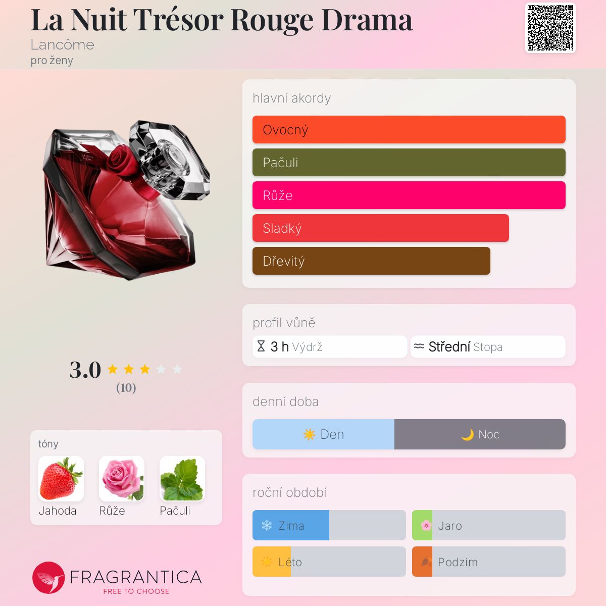 La Nuit Trésor Rouge Drama podle Lancôme je Floral Fruity vůně pro ženy. Toto je nová vůně. La Nuit Trésor Rouge Drama byl/a uveden/a v roce 2026. Vrchní tóny jsou Jahoda, Citrónová kůra a Bergamot; střední tóny jsouČervená růže, Damašská růže, Ylang-Ylang a Fialka ; základní tóny jsou Vanilka, Pačuli a Sametová dřeva.