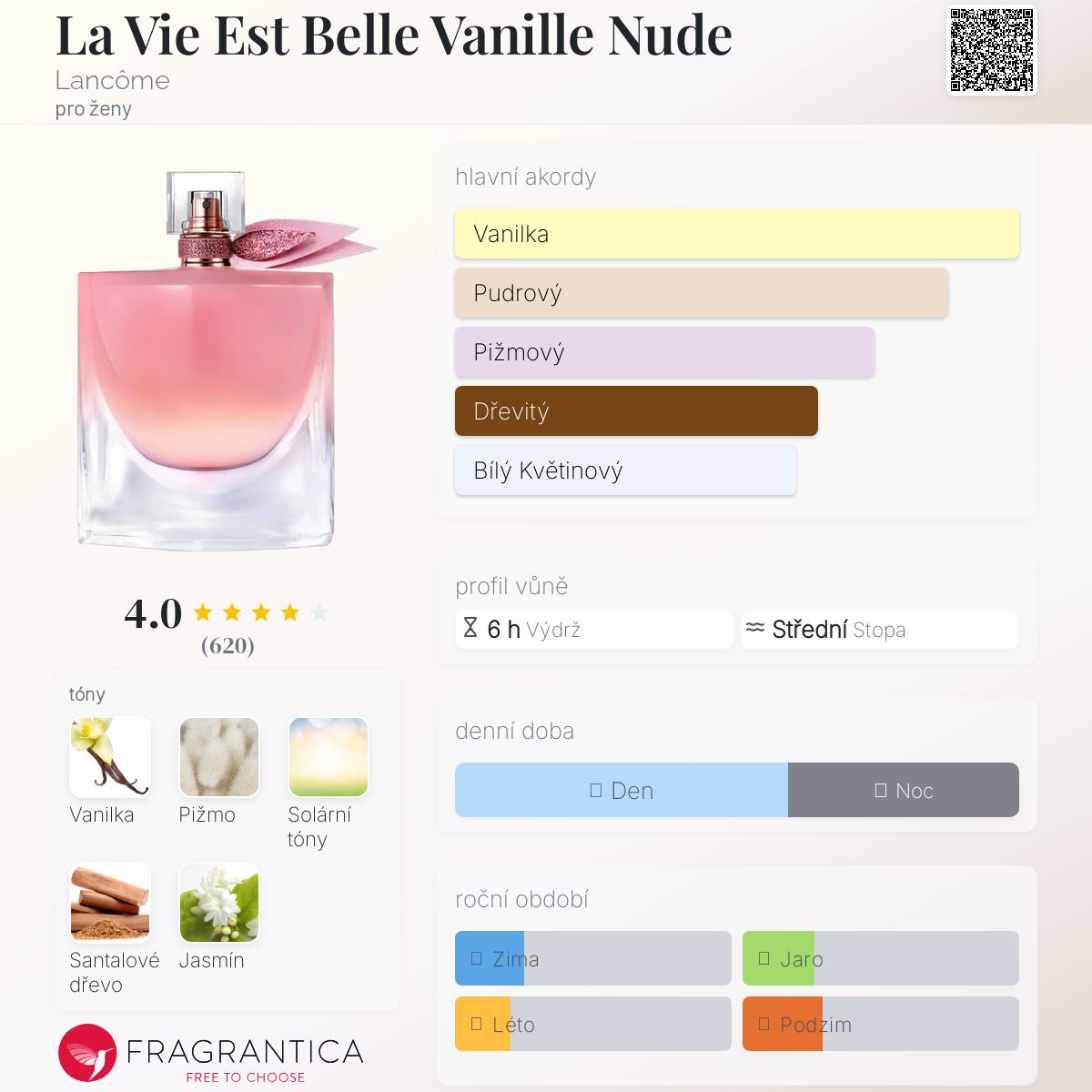 La Vie Est Belle Vanille Nude podle Lancôme je Orientální Floral vůně pro ženy. Toto je nová vůně. La Vie Est Belle Vanille Nude byl/a uveden/a v roce 2025. La Vie Est Belle Vanille Nude byl/a vytvořen/a Anne Flipo a Dominique Ropion. Vrchní tóny jsou Solární tóny a Jasmín; střední tón jeBourbonská vanilka ; základní tóny jsou Bílé pižmo a Santalové dřevo.