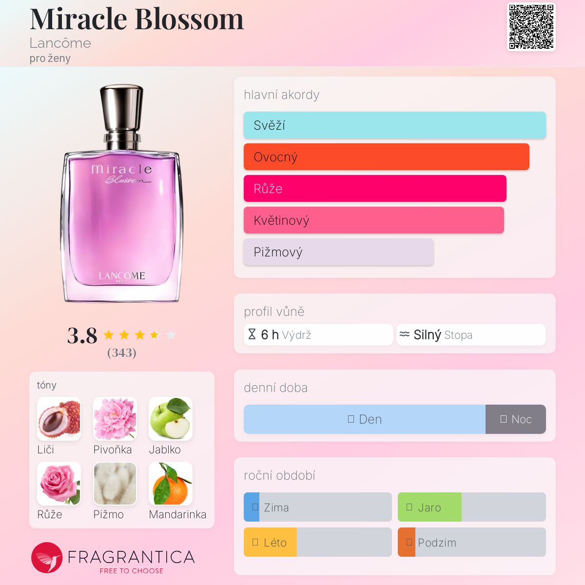 Miracle Blossom podle Lancôme je Floral vůně pro ženy. Miracle Blossom byl/a uveden/a v roce 2016. Vrchní tóny jsou Liči, Granny Smith jablko a Mandarinka; střední tóny jsouPivoňka, Růže a Jasmín ; základní tóny jsou Pižmo a Santalové dřevo.