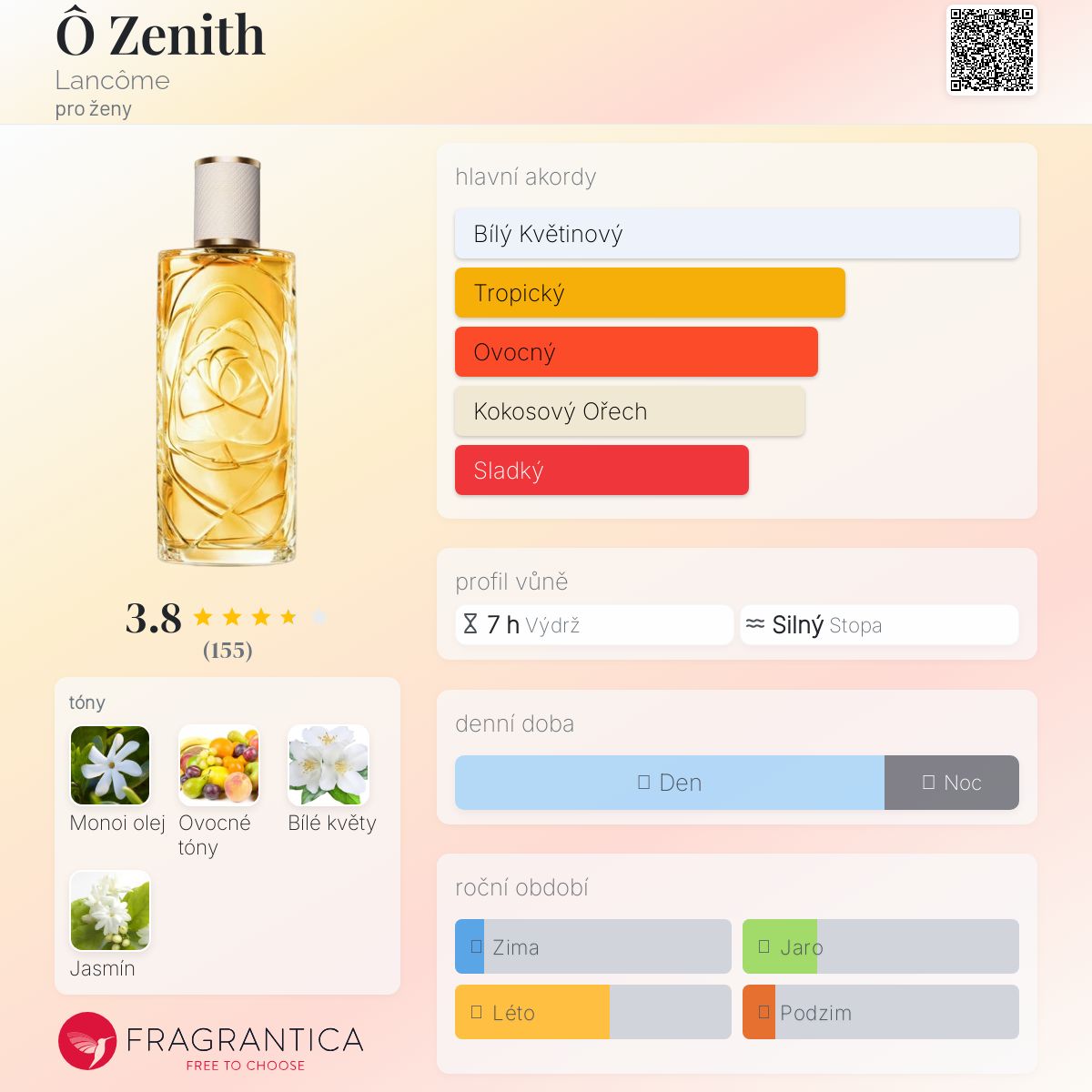 Ô Zenith podle Lancôme je Floral Fruity vůně pro ženy. Toto je nová vůně. Ô Zenith byl/a uveden/a v roce 2025. "Nosem" za touto vůní je Dominique Ropion. Vrchní tón je Ovocné tóny ; střední tóny jsouBílé květy a Jasmín ; základní tón je Monoi olej.