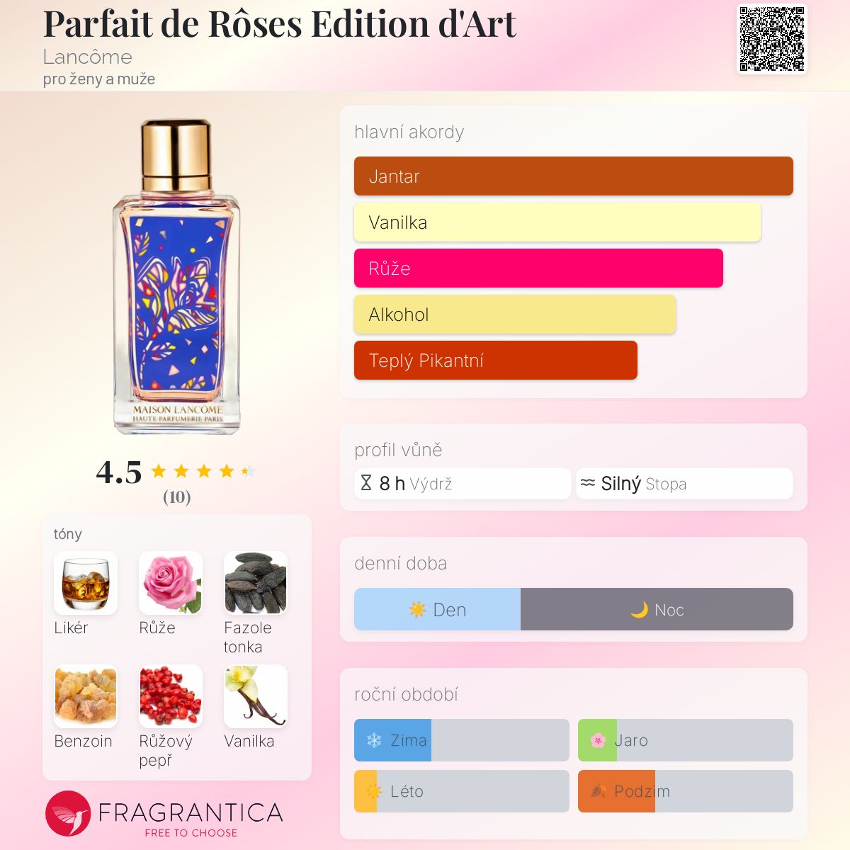 Parfait de Rôses Edition d'Art podle Lancôme je Floral vůně pro ženy a muže. Parfait de Rôses Edition d'Art byl/a uveden/a v roce 2017. "Nosem" za touto vůní je Nathalie Lorson. Vrchní tóny jsou Růžový pepř a Aldehydy; střední tóny jsouLikér, Travní růže a Růže ; základní tóny jsou Fazole tonka, Benzoin, Vanilka, Olibanum a Kořen orris.