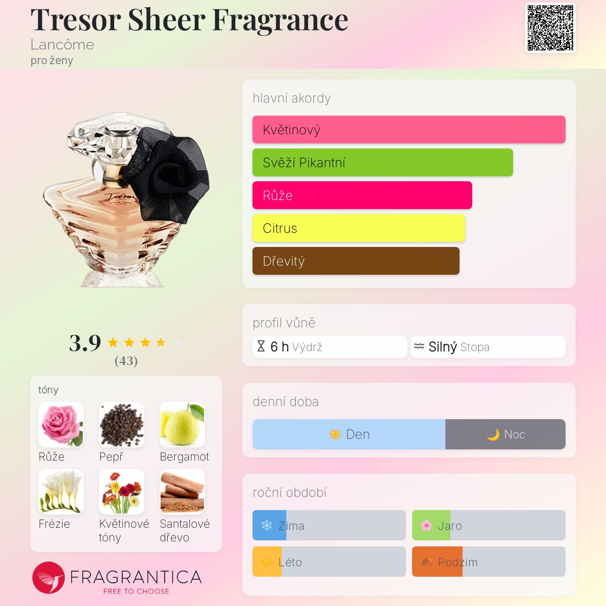 Tresor Sheer Fragrance podle Lancôme je Floral Fruity vůně pro ženy. Tresor Sheer Fragrance byl/a uveden/a v roce 2009. "Nosem" za touto vůní je Sophia Grojsman. Vrchní tóny jsou Pepř, Bergamot a Cesmína; střední tóny jsouRůže, Frézie a Květinové tóny ; základní tón je Santalové dřevo.