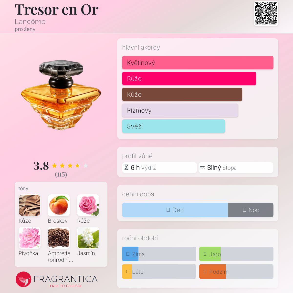 Tresor en Or podle Lancôme je Orientální Floral vůně pro ženy. Tresor en Or byl/a uveden/a v roce 2019. "Nosem" za touto vůní je Dominique Ropion. Vrchní tón je Broskev ; střední tóny jsouTurecká růže, Pivoňka a Jasmín ; základní tóny jsou Kůže, Ambrette (přírodní pižmo) a Pižmo.